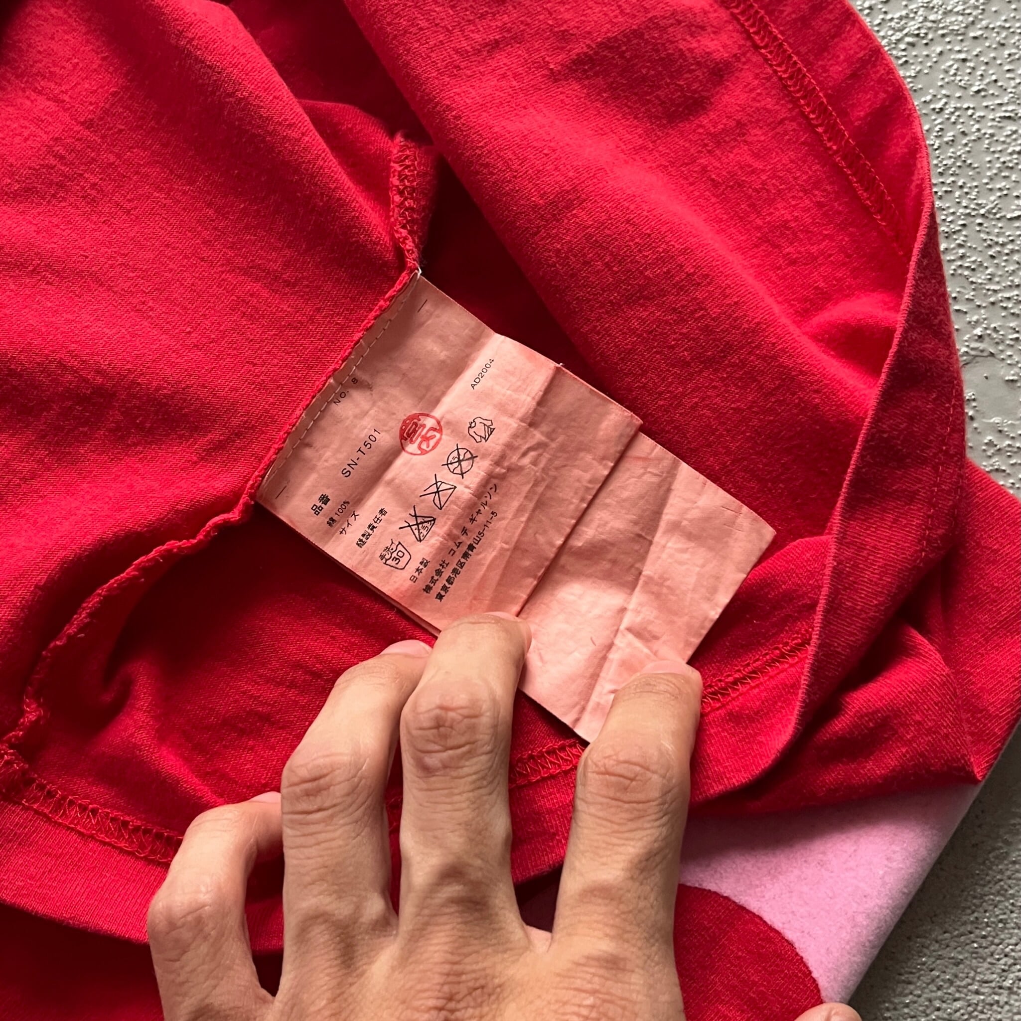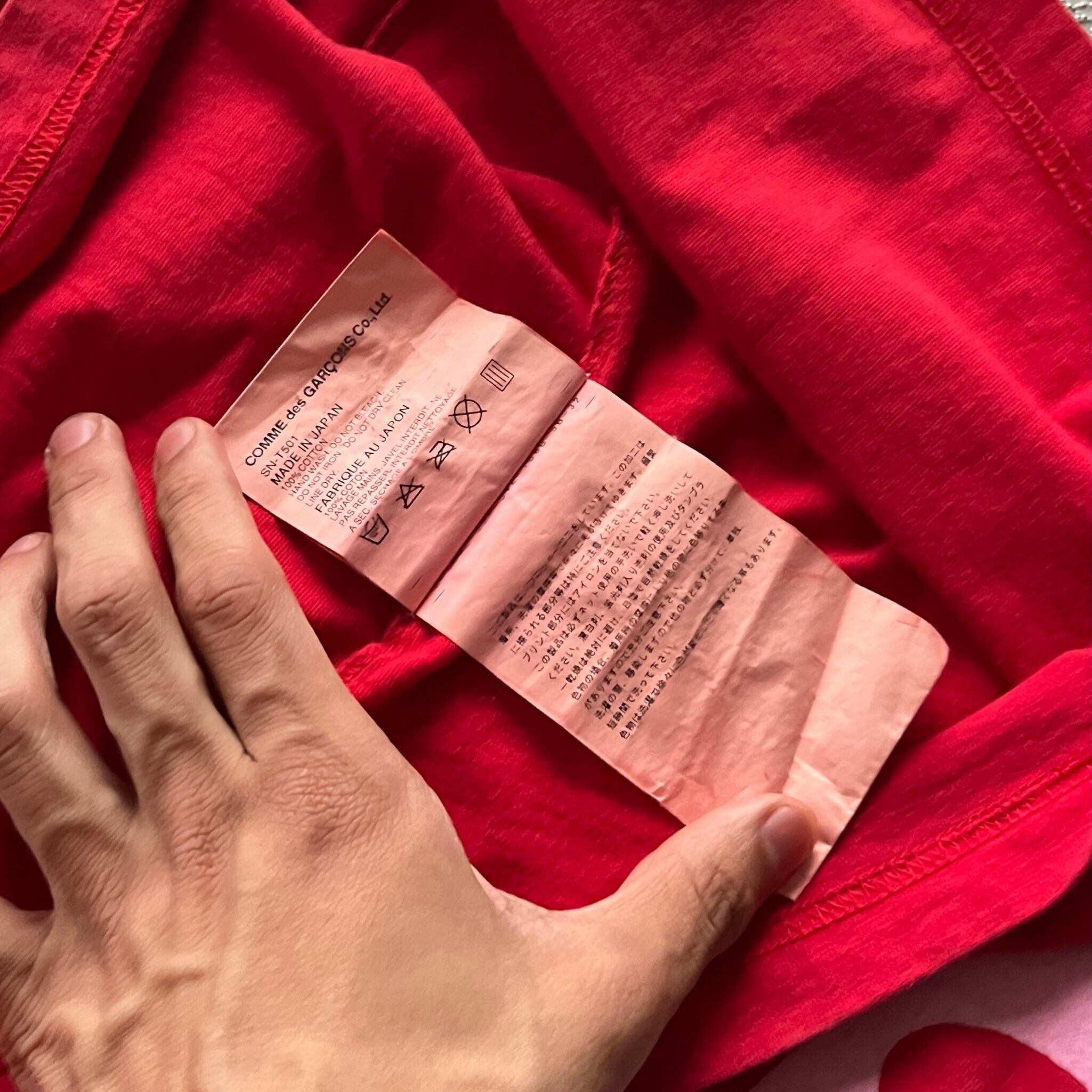 ボディ全体が薬品染めによって深みのある赤色の風合いになっています。加えて肌触り、質感を含め最高の1着です。