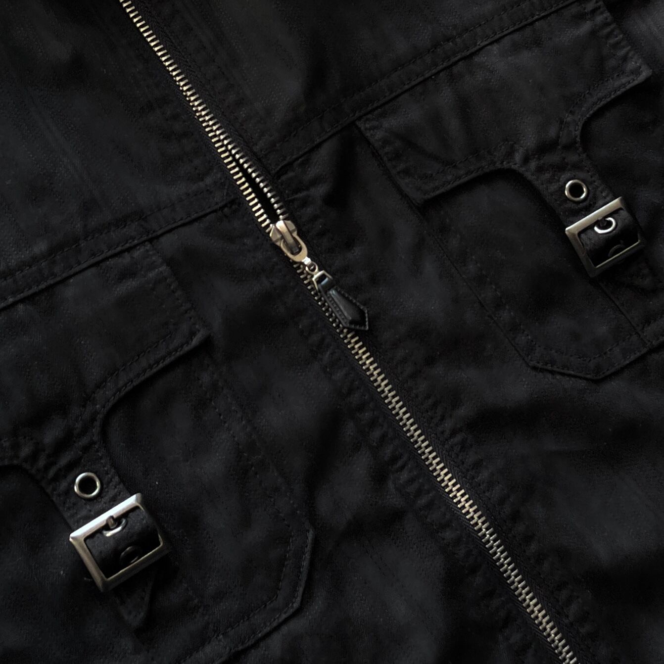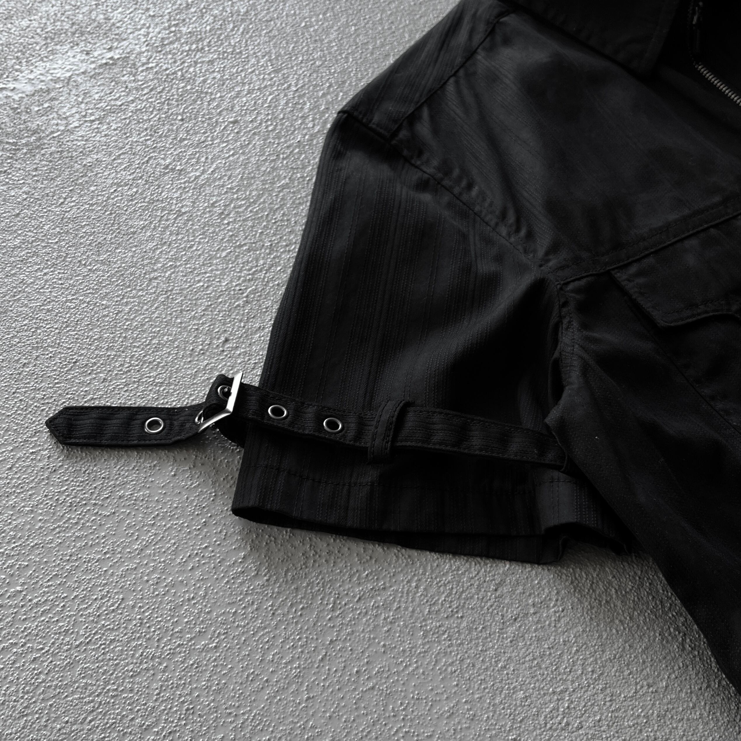 フロントジップ仕様、ポケット周辺に見られる2つずつ縫い付けられたスタッズ、ギミックの効いたカーゴパンツなどで見られるカーゴポケット、ベルトで巻きつけられたボンテージデザインが特徴的な1着。