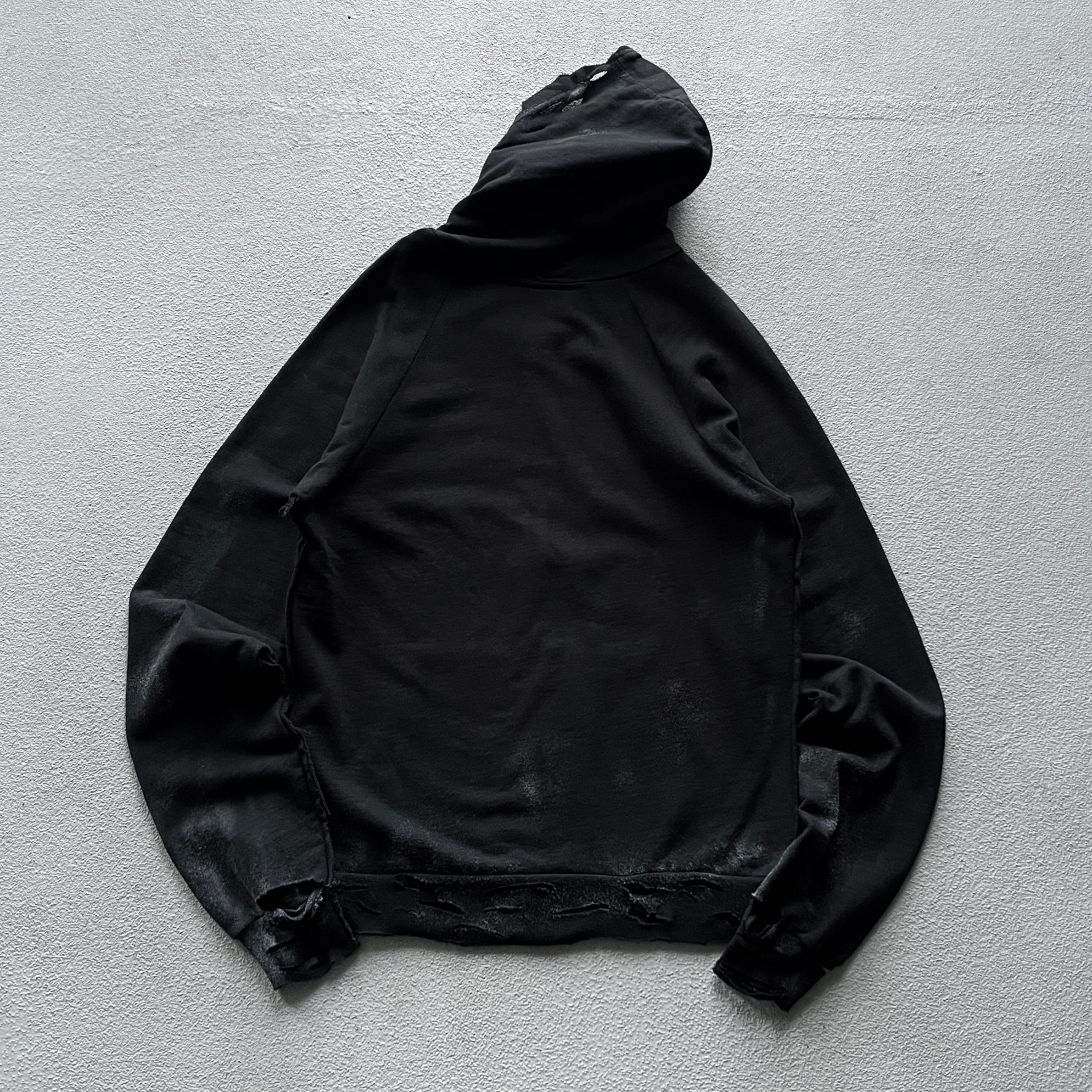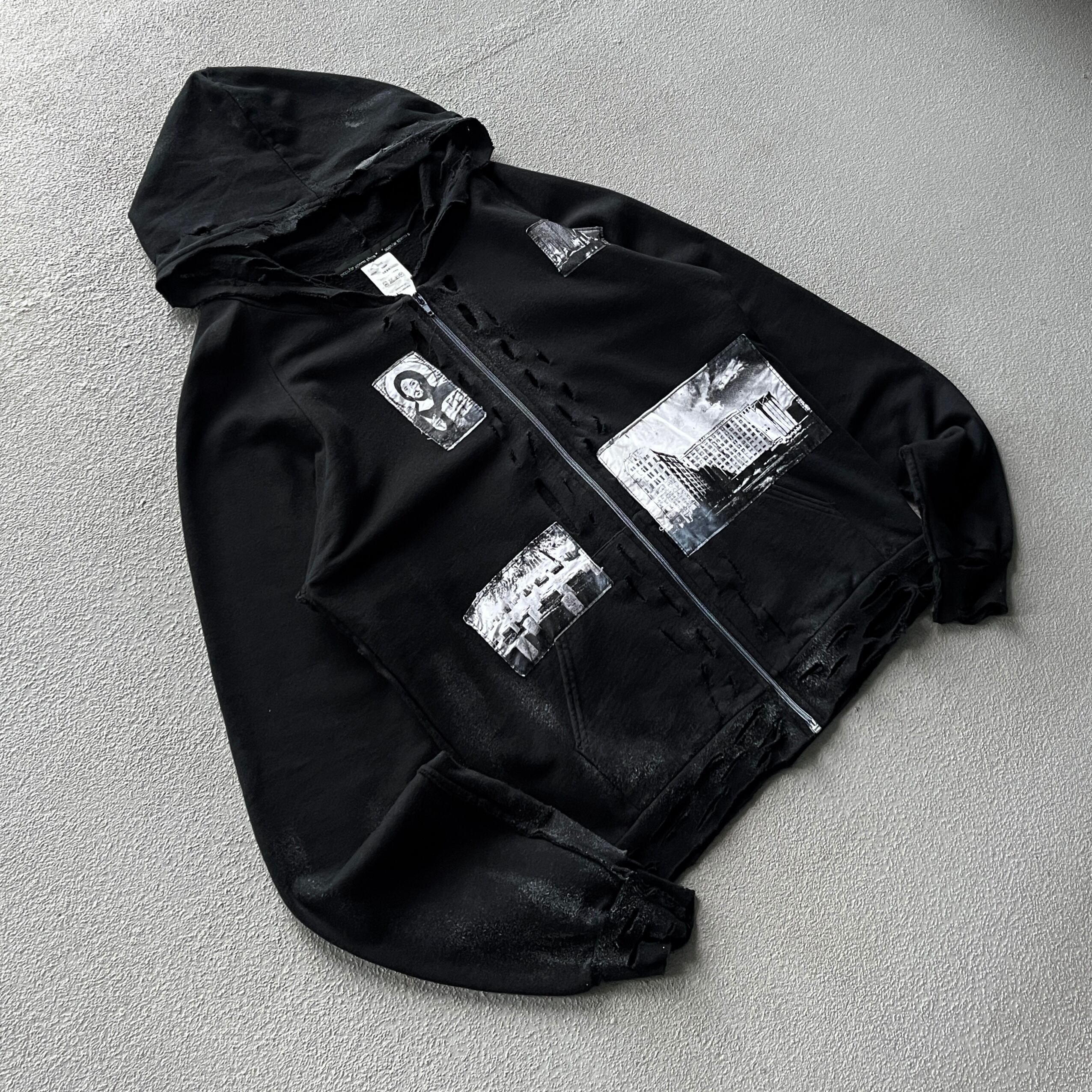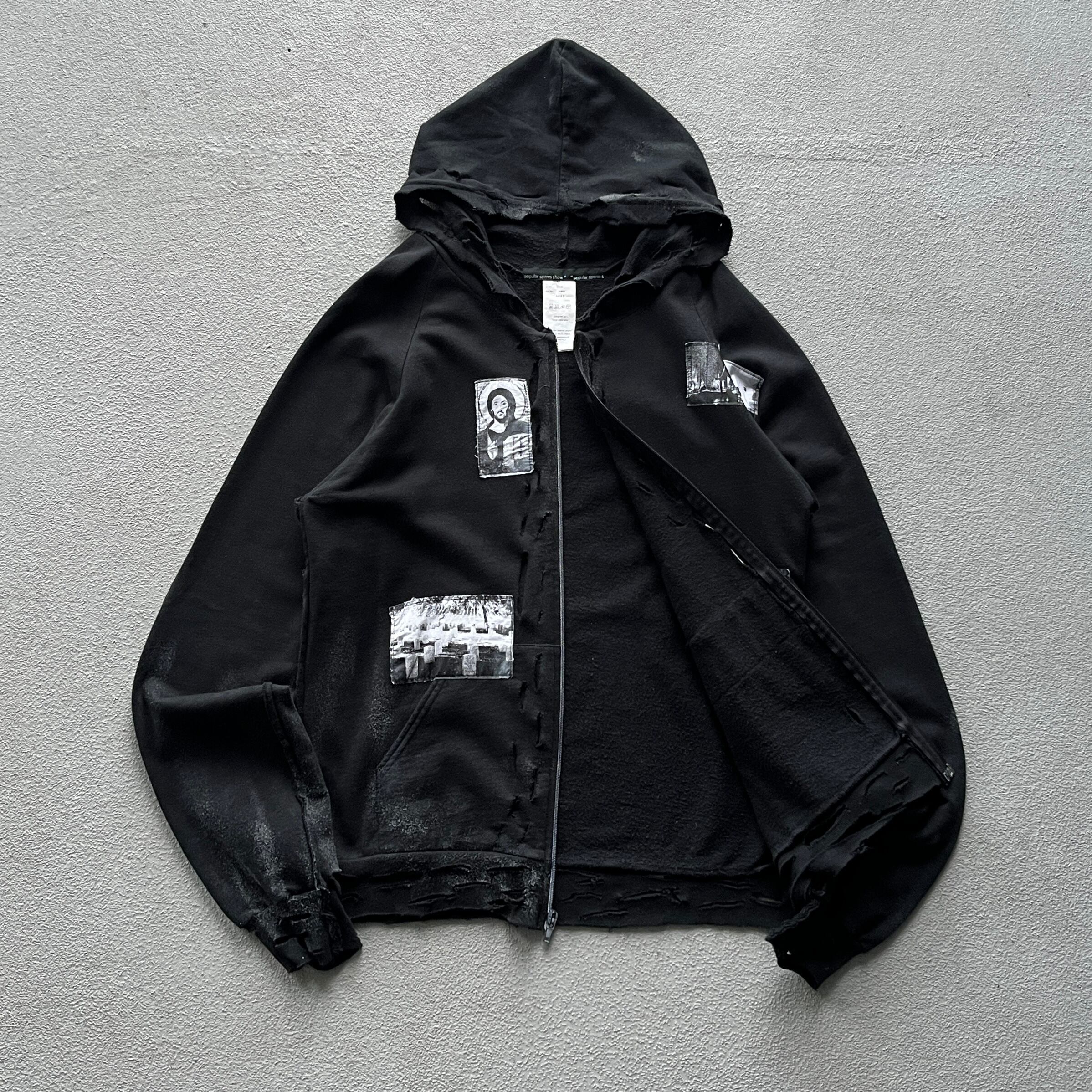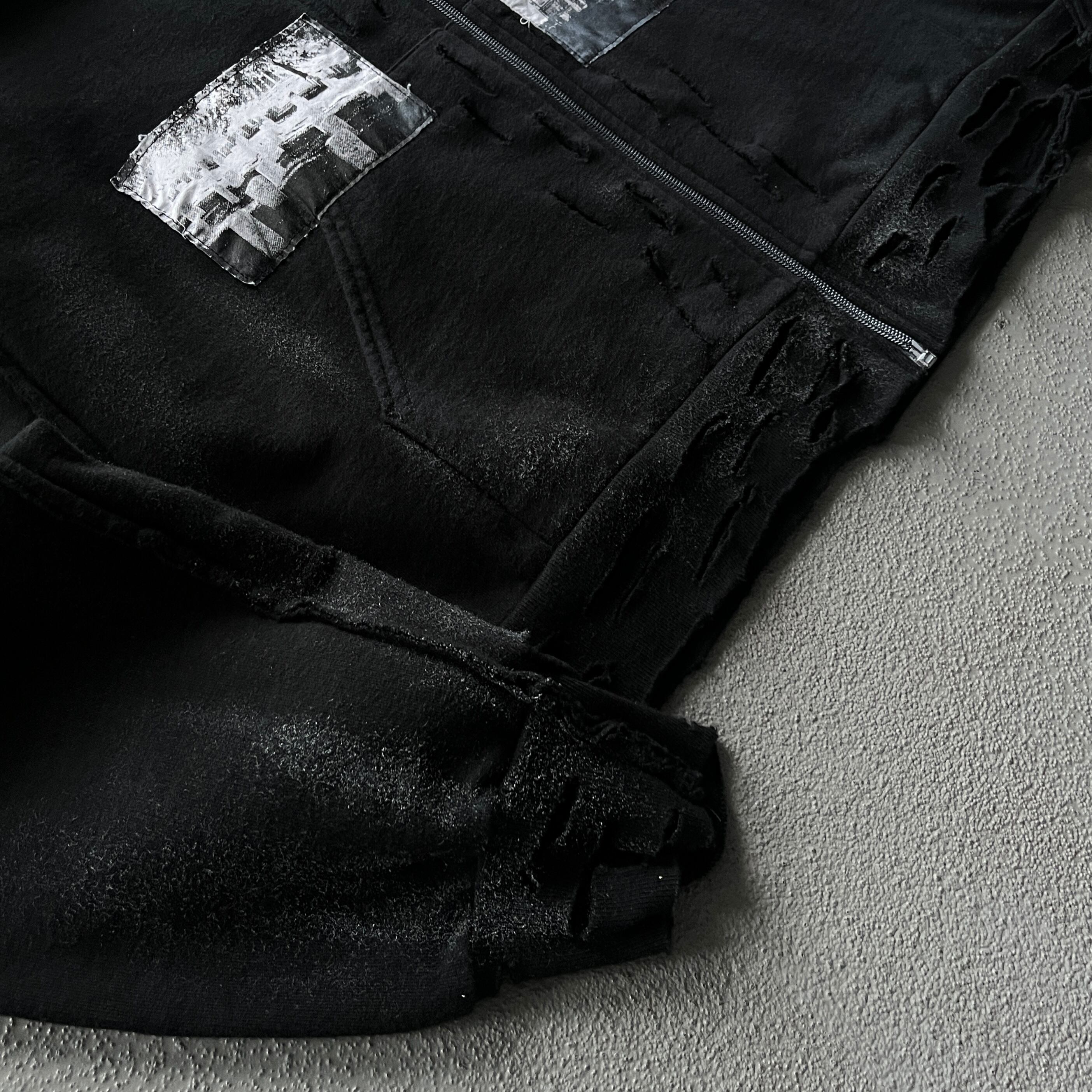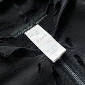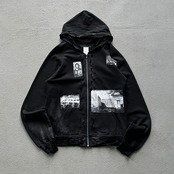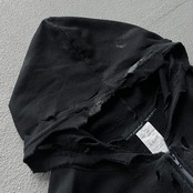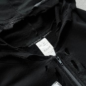 ブランドが得意とするクラッシュ加工がフーディ部分、ジップフロント周辺、袖などの至る部分に入り、それに合わせてペイント加工も行われたパンクスタイルのものです。