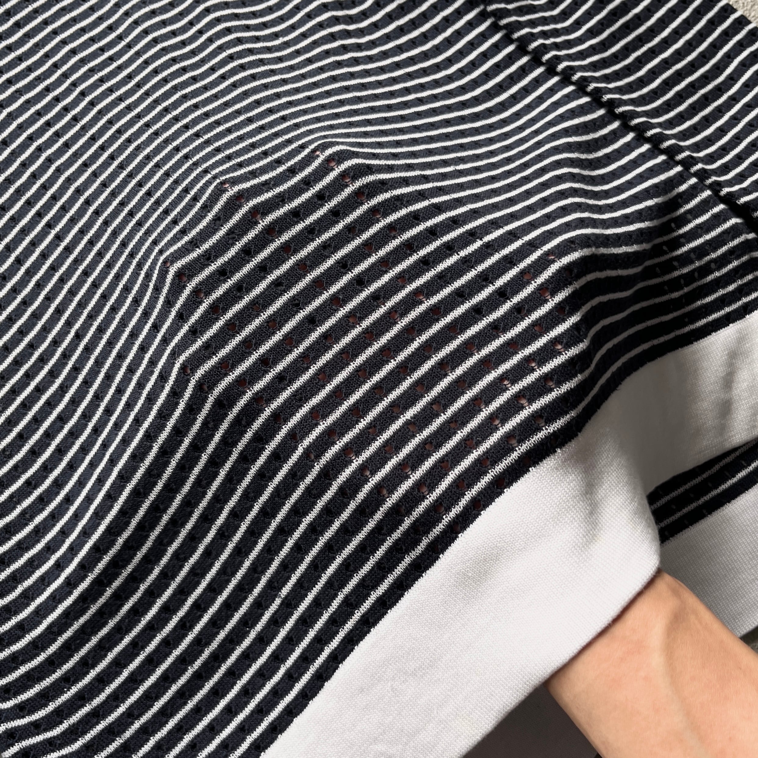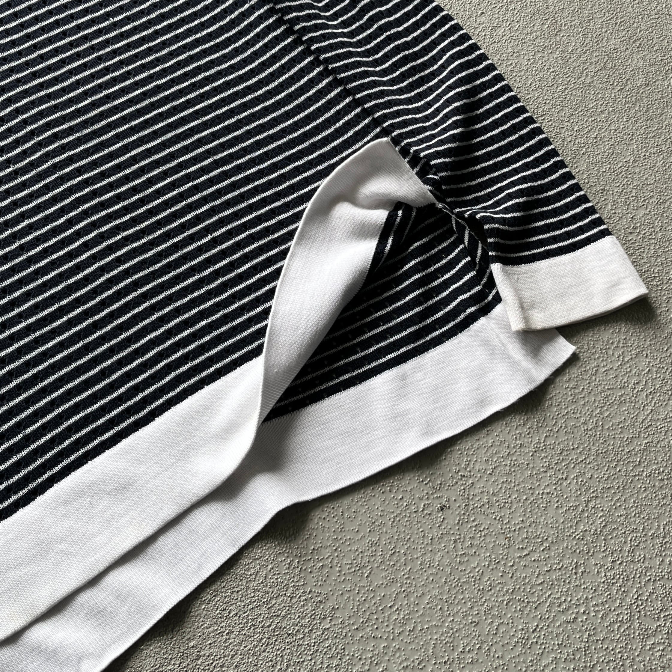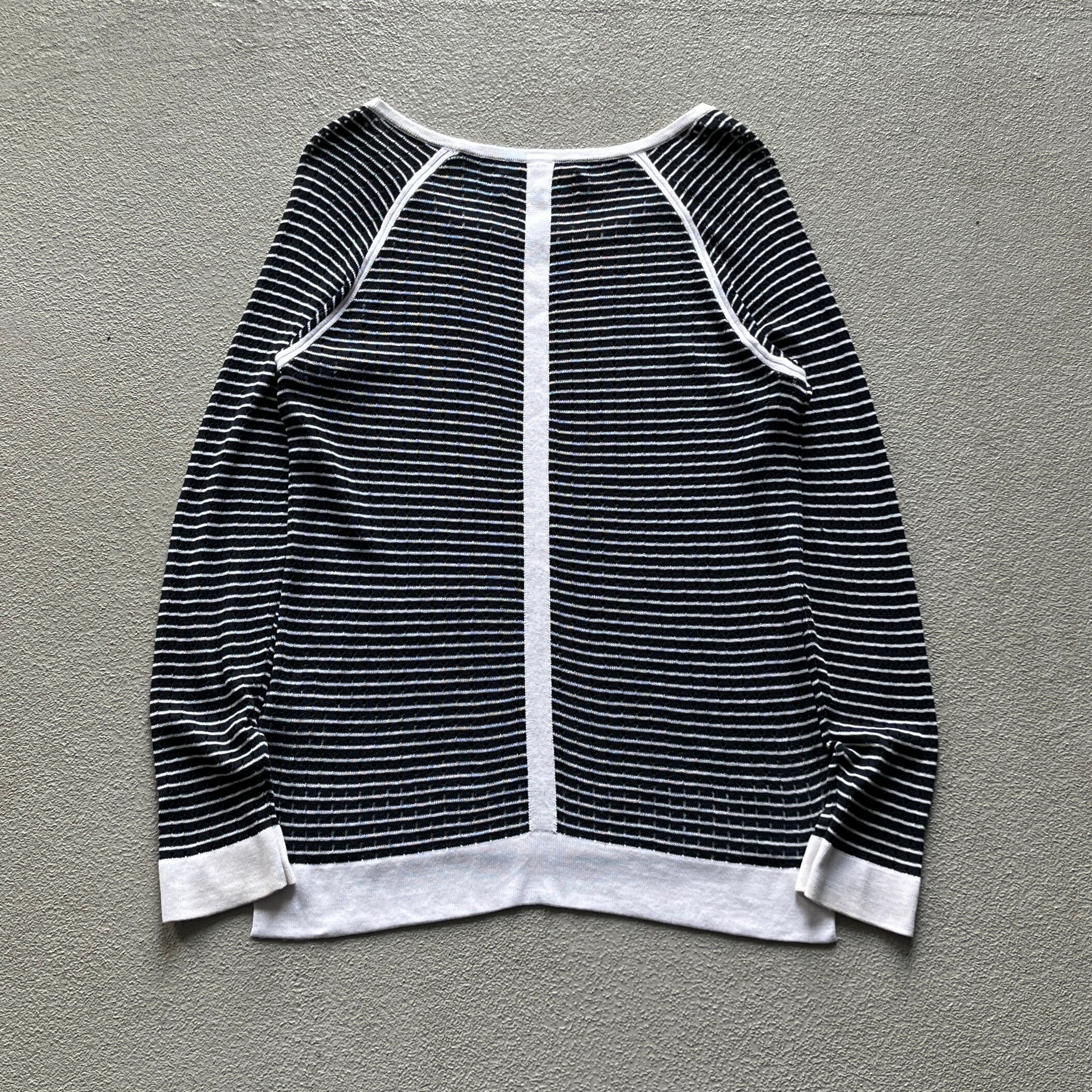 やや透け感のあるニットで表裏両方にカーブの入ったパイピング、特に裏面には背骨を擦るように真っ直ぐに伸びたパイピングデザインのもので中性的な雰囲気。