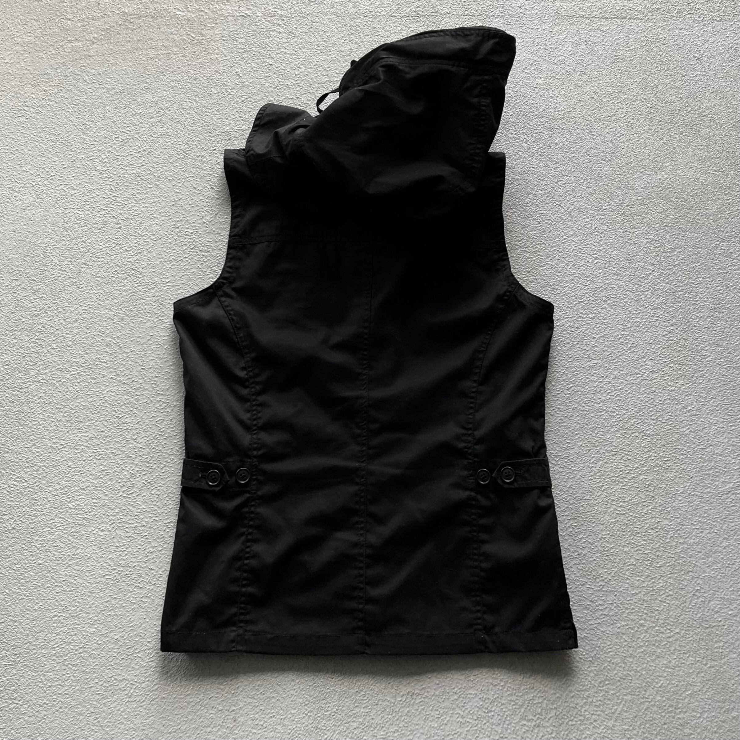 フードはワイヤーの入った立体的なシルエットと付け襟のような少し丸みのあるラペルデザイン。