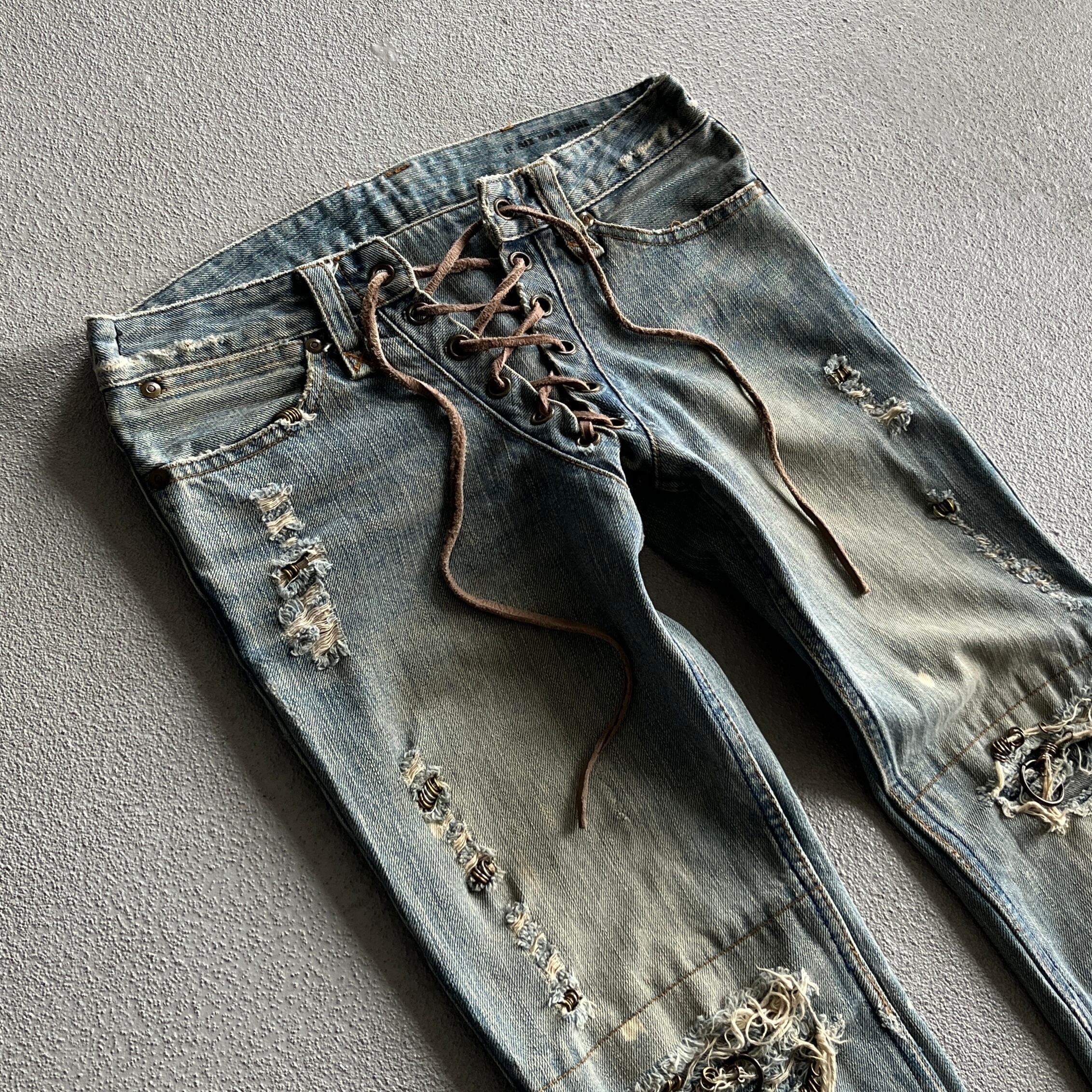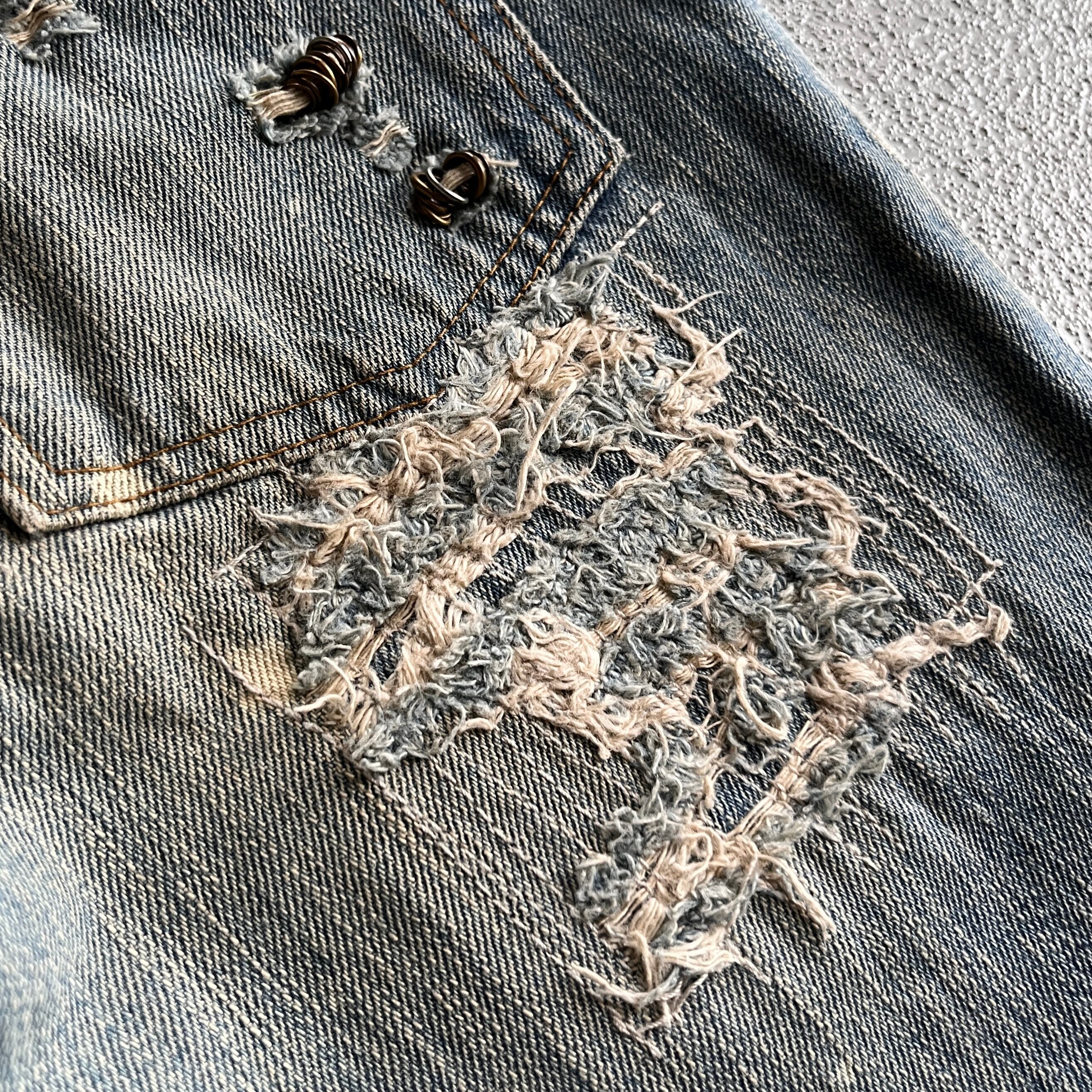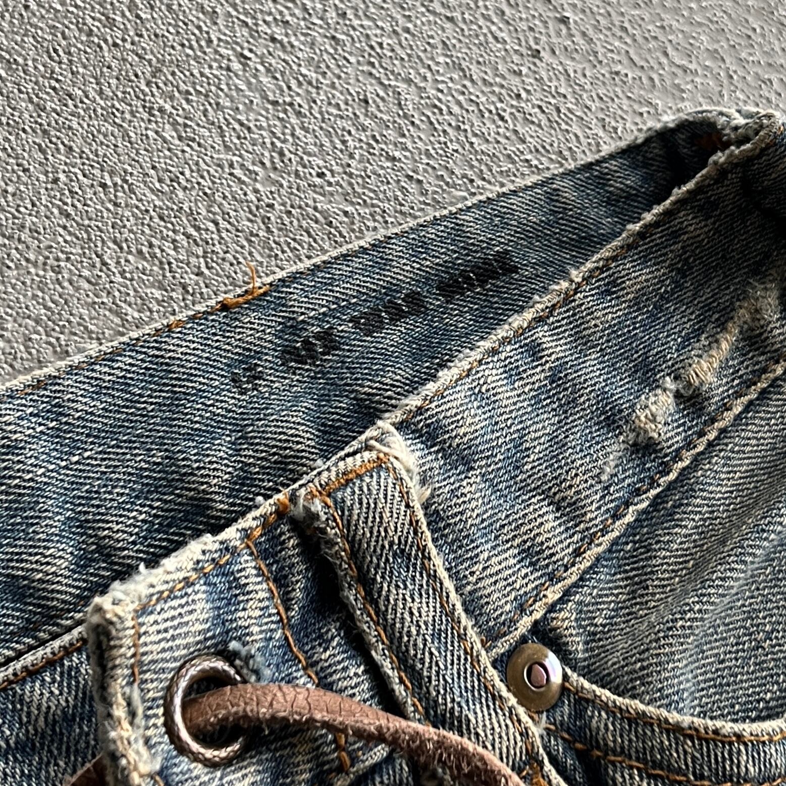 古き良き時代の要素を残しつつディテールとしてリペアされた部分にはピアス装飾や、シューレースによるウエストの調節など他のアイテムでは味わえない魅力があります。