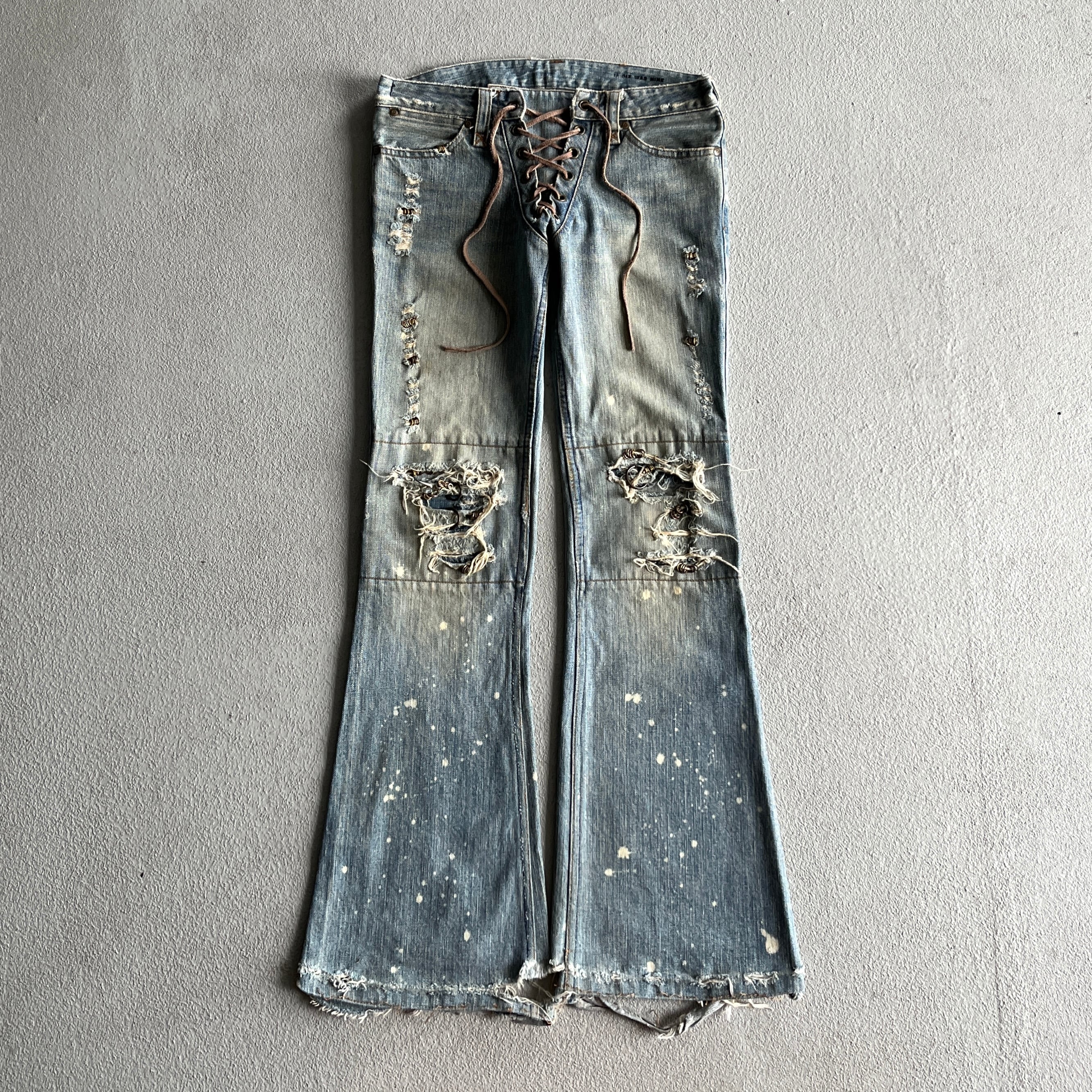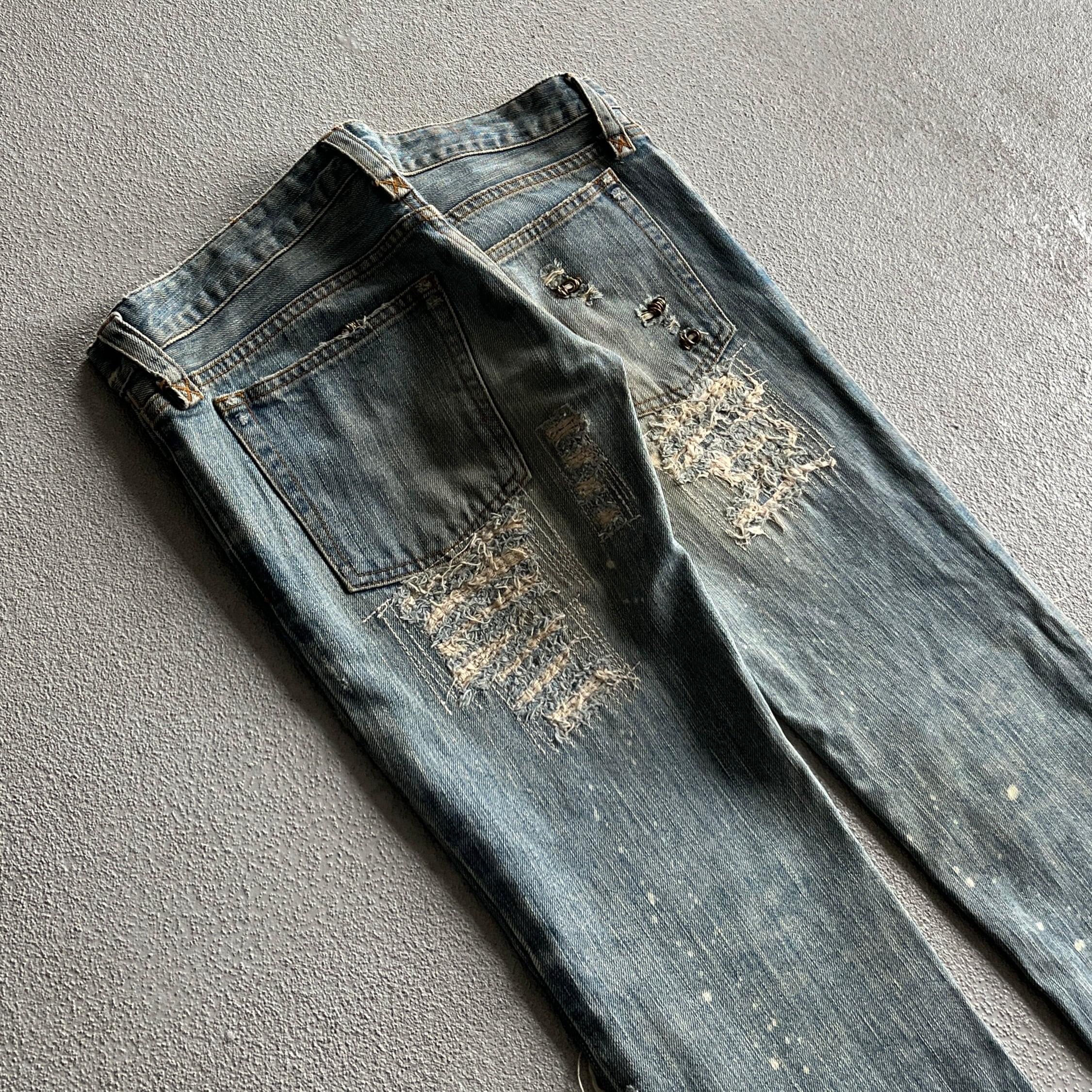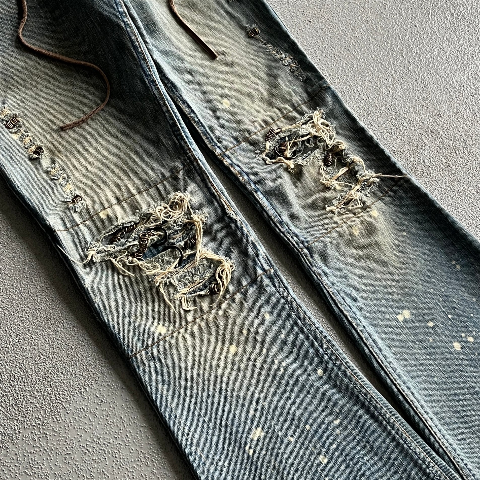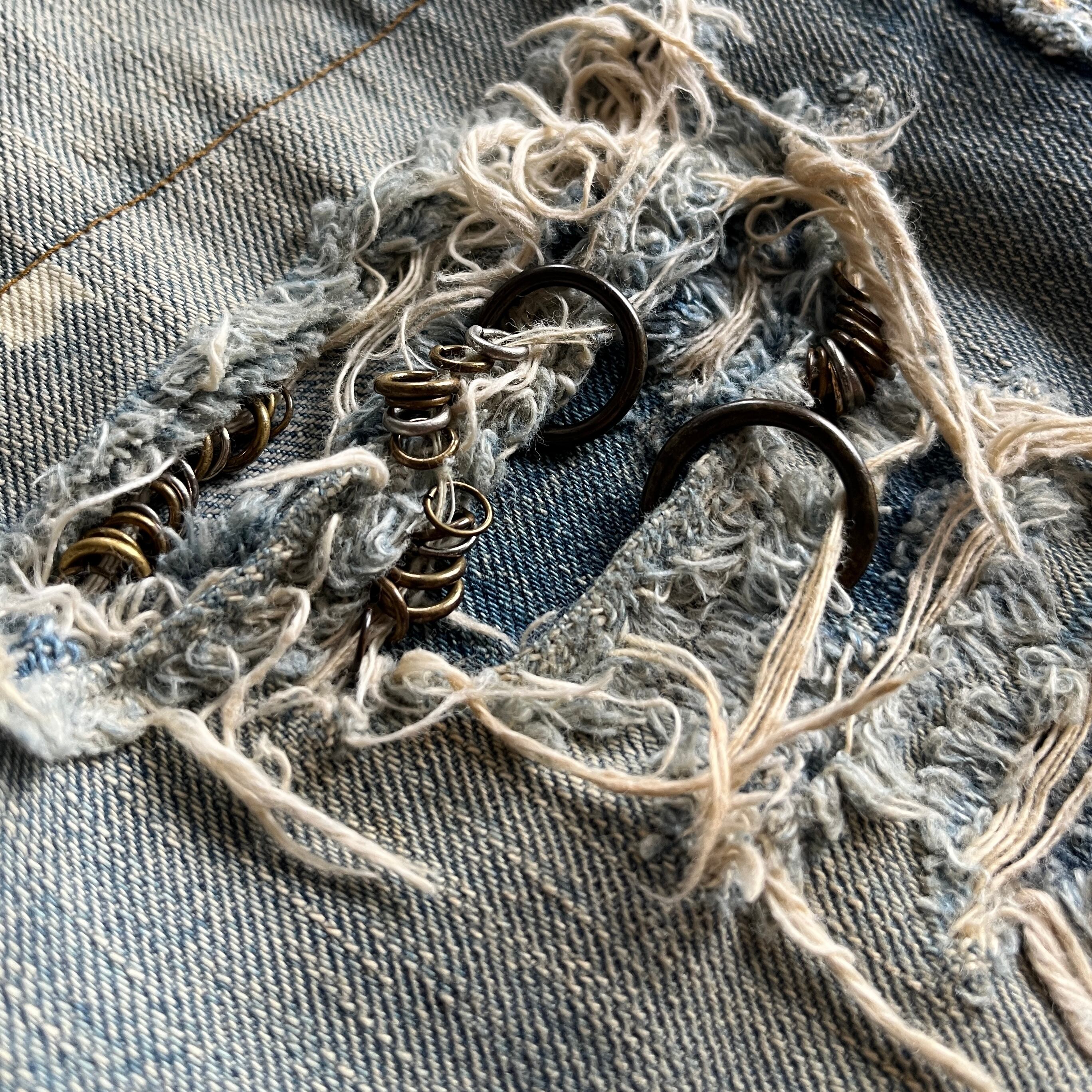 古き良き時代の要素を残しつつディテールとしてリペアされた部分にはピアス装飾や、シューレースによるウエストの調節など他のアイテムでは味わえない魅力があります。