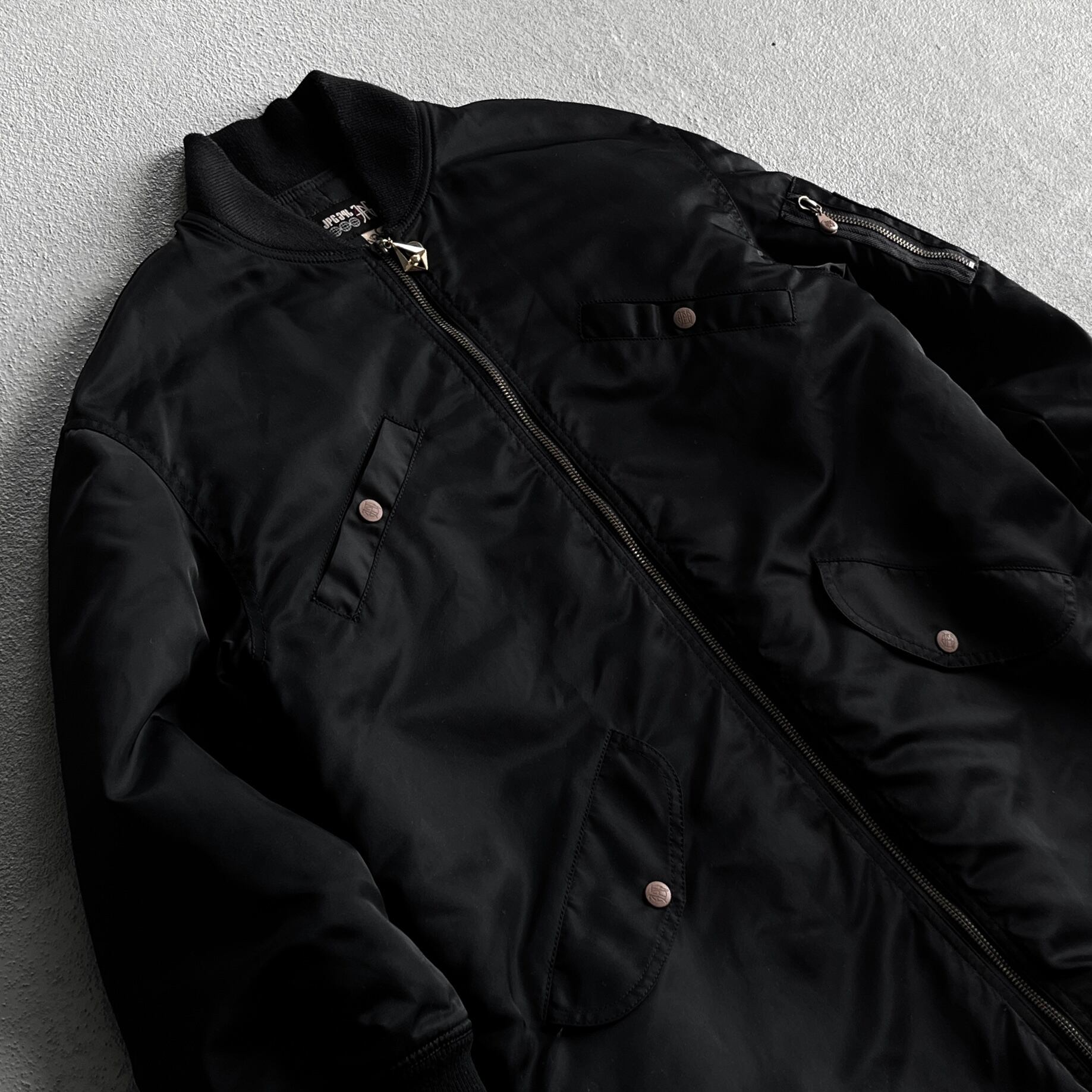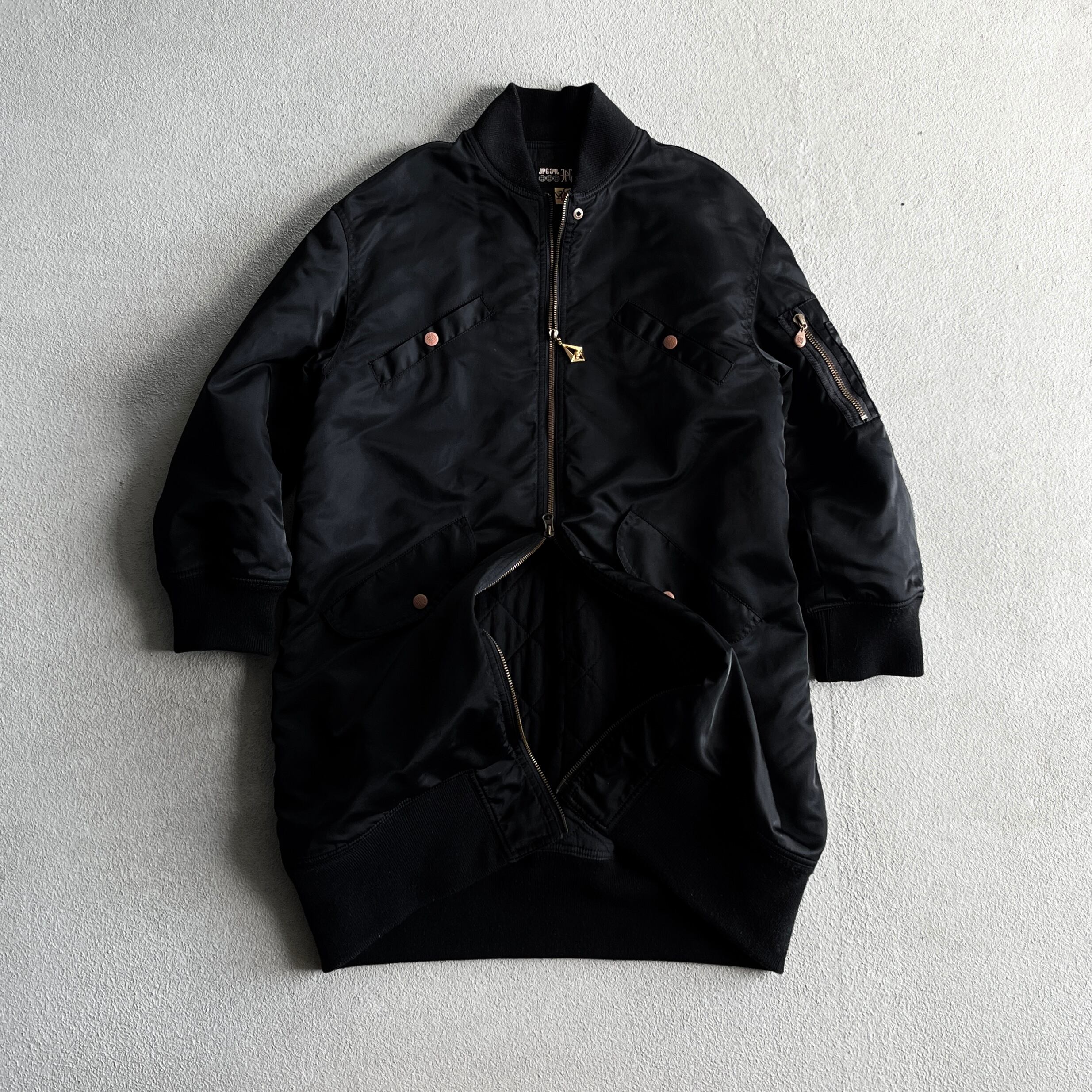 他にも木目調のjpgと刻印の入ったゴルチエらしい遊び心のあるデザインボマージャケットになります。