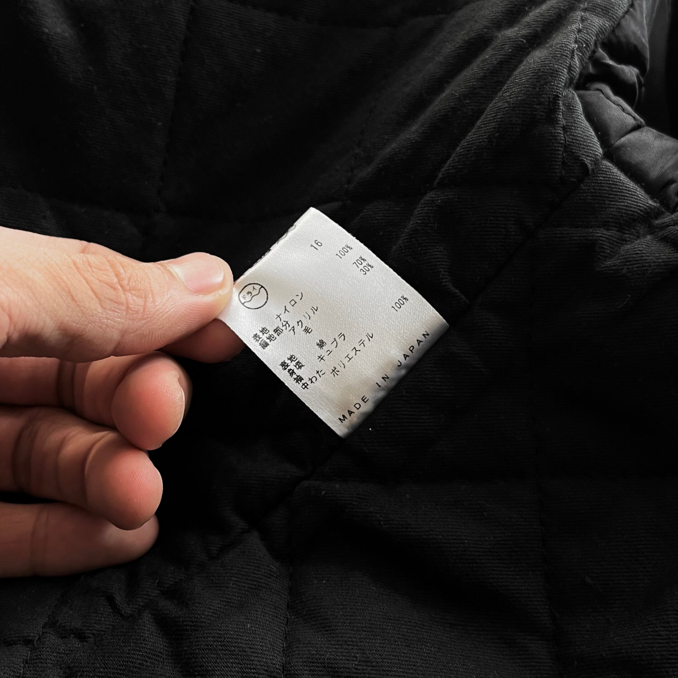 ややオーバサイズシルエット、丈は膝丈に近いものでコートの感覚のもので個人的にモードな雰囲気シャツにネクタイの上から羽織りとして丈が長めに取られていますが更に長めのものを選んでいただきレイヤードしていただいてより楽しんでいただけるかと思います。