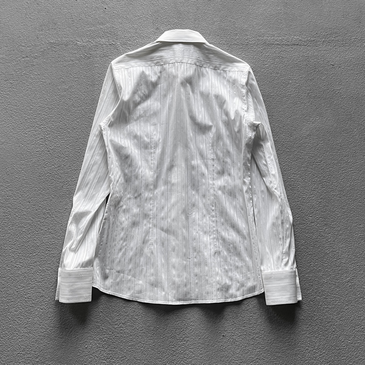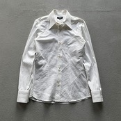 各所にビジューが散りばめられており若干の光沢感、全体はストライブ、前見頃ボディ部分がツギハギによるデザインシャツになります。