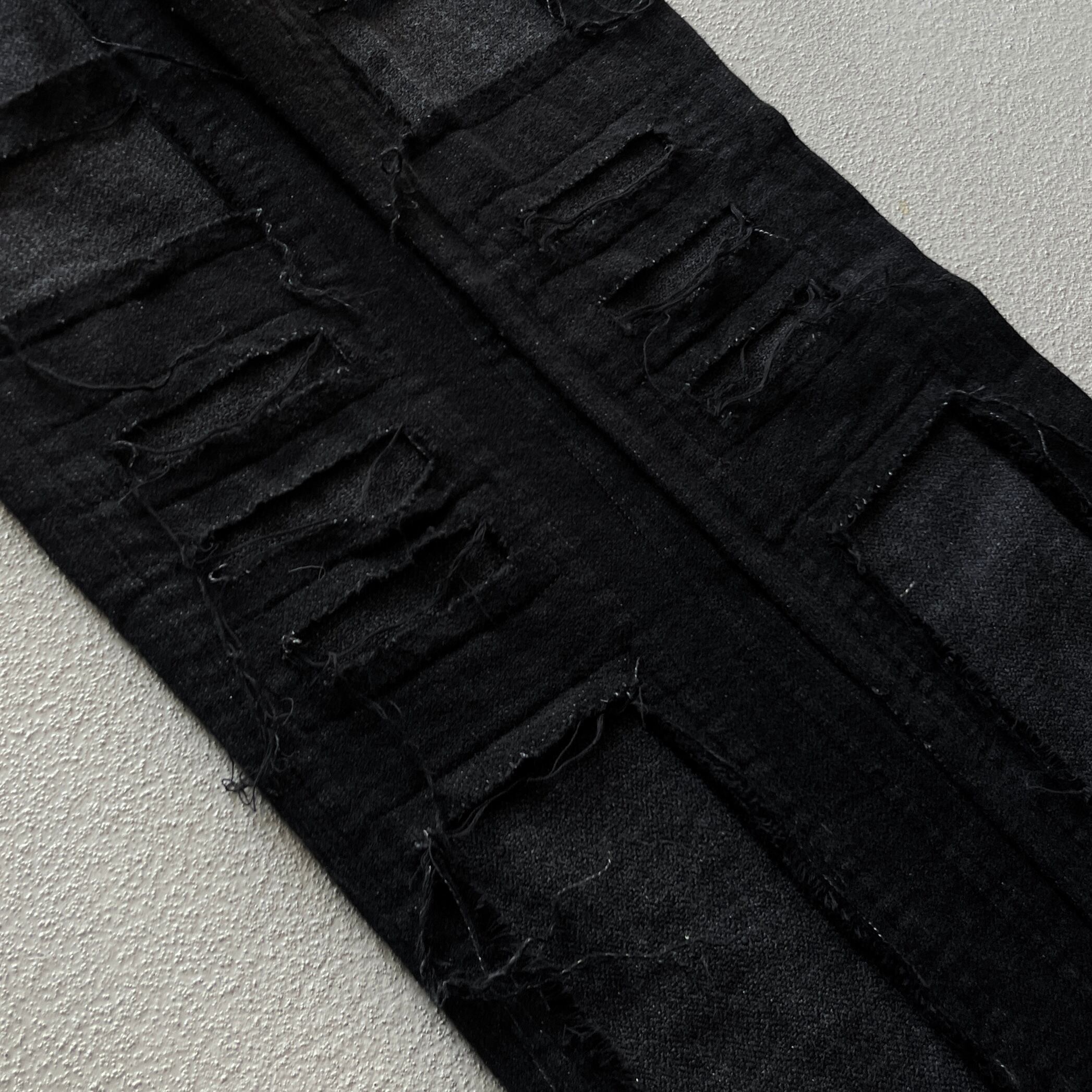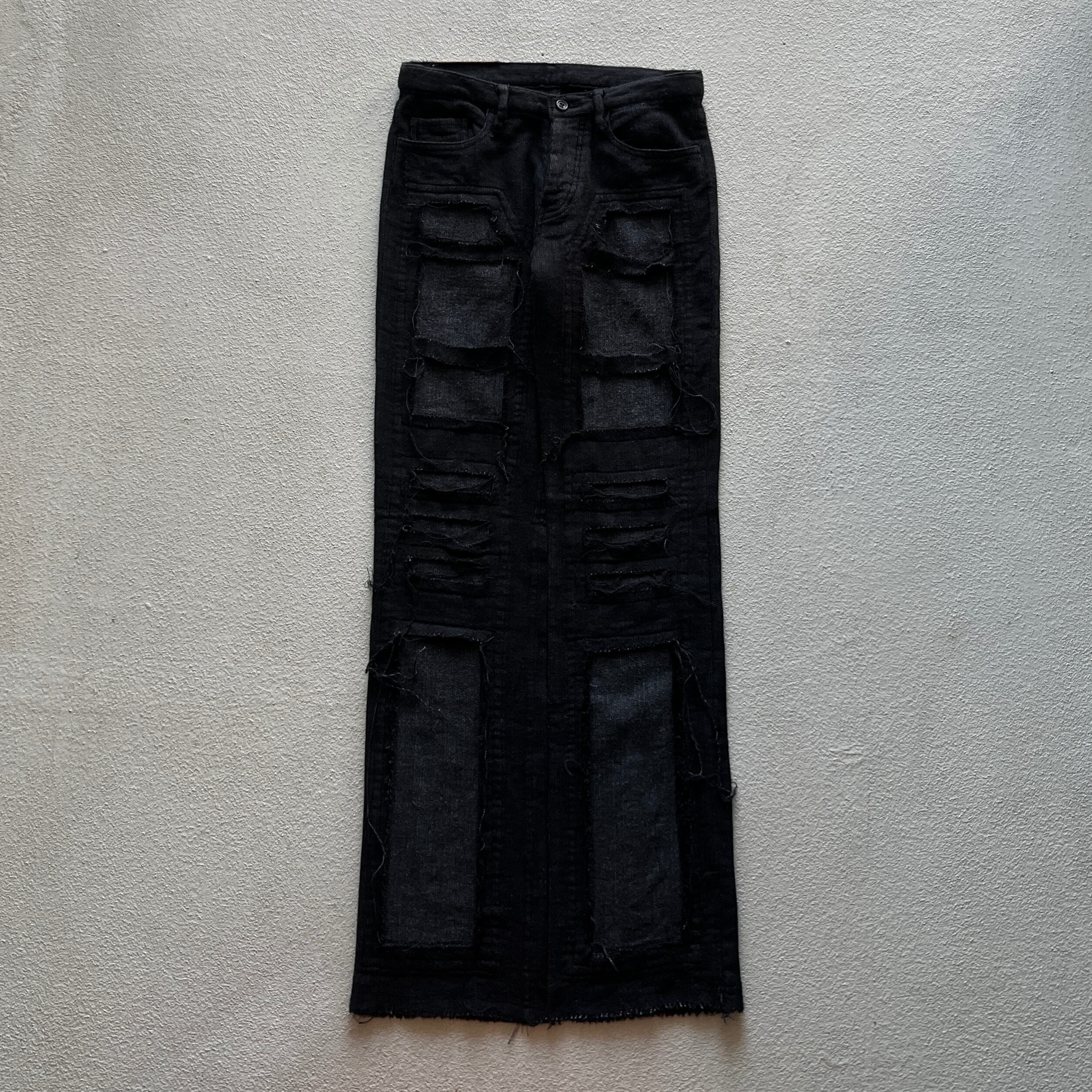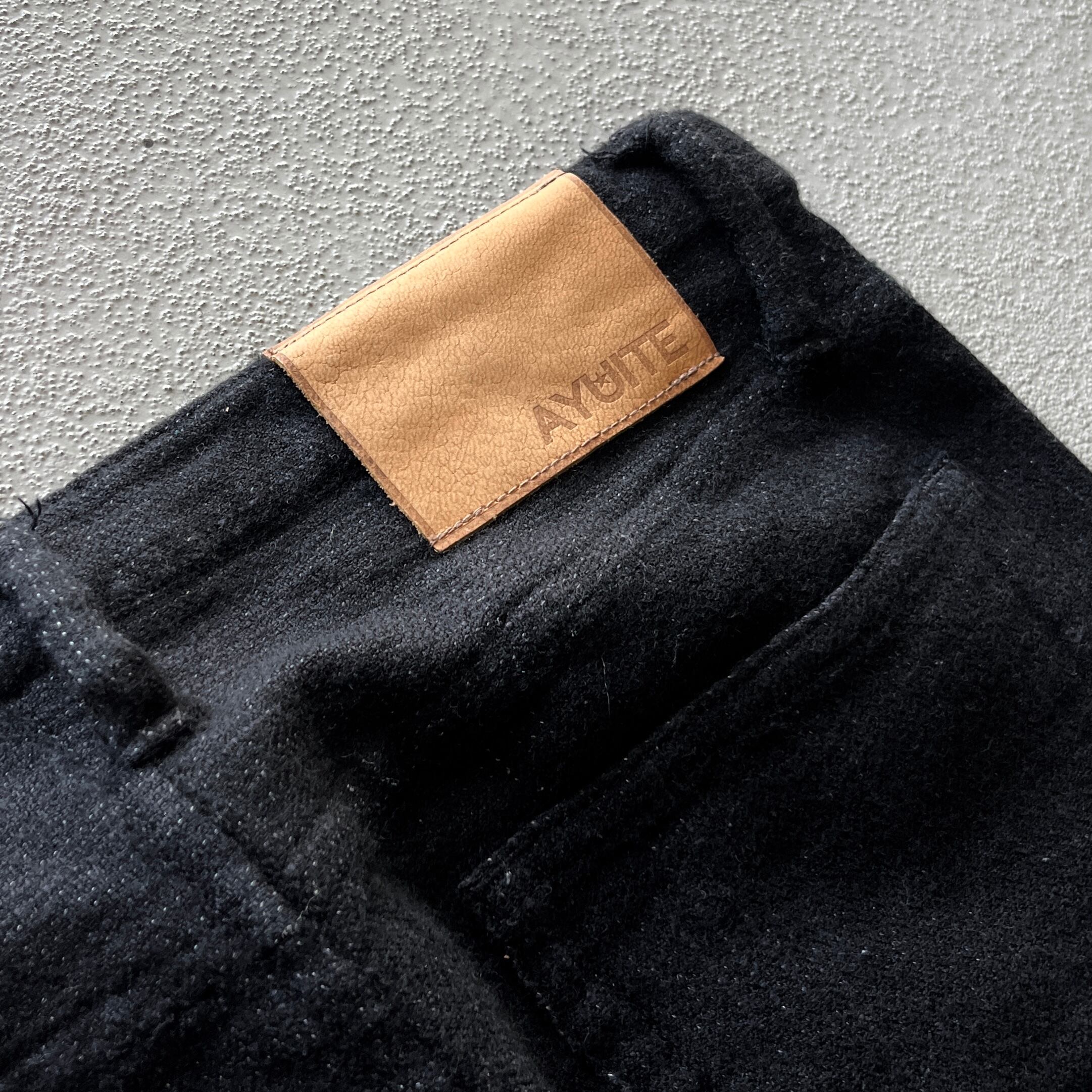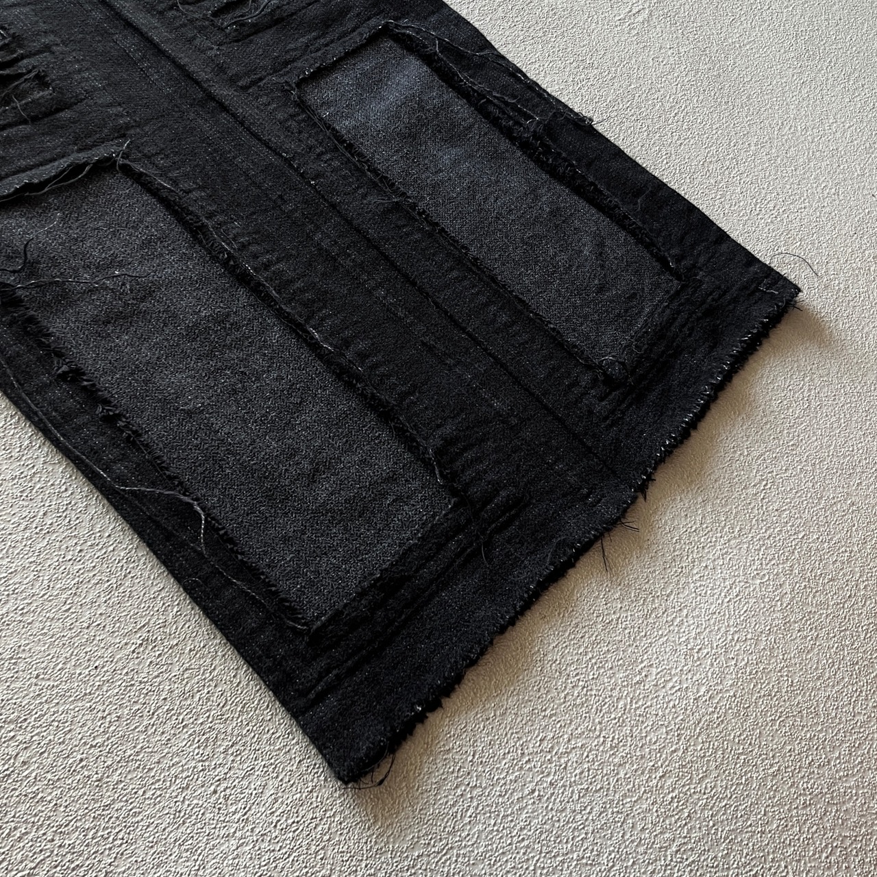 特徴としてペインターパンツに見られるような補強パッチが表からではなく裏から縫い付けられています。そのため腿から裾にかけては二重構造の作り。一部はパッチワーク、カットオフで剥ぎ取られたような表現がされています。