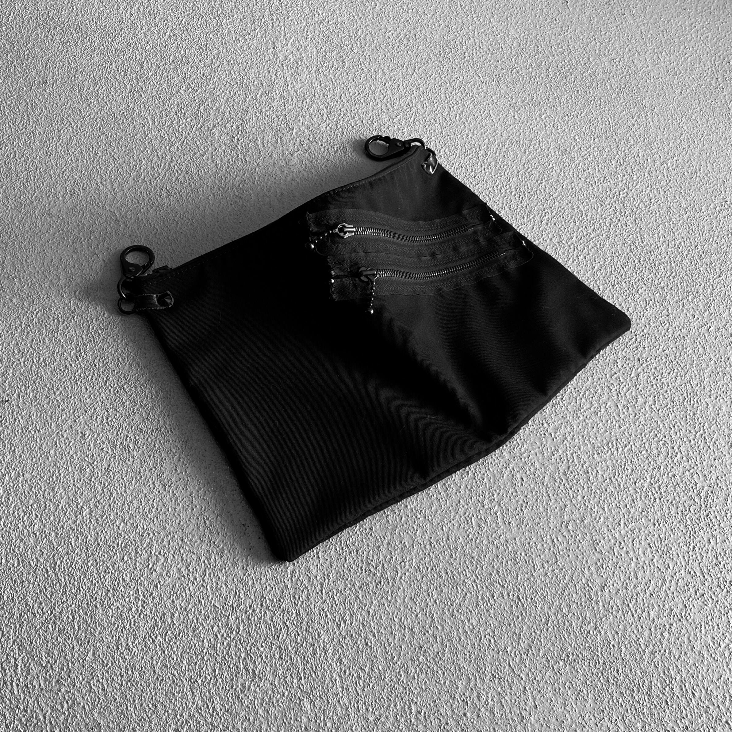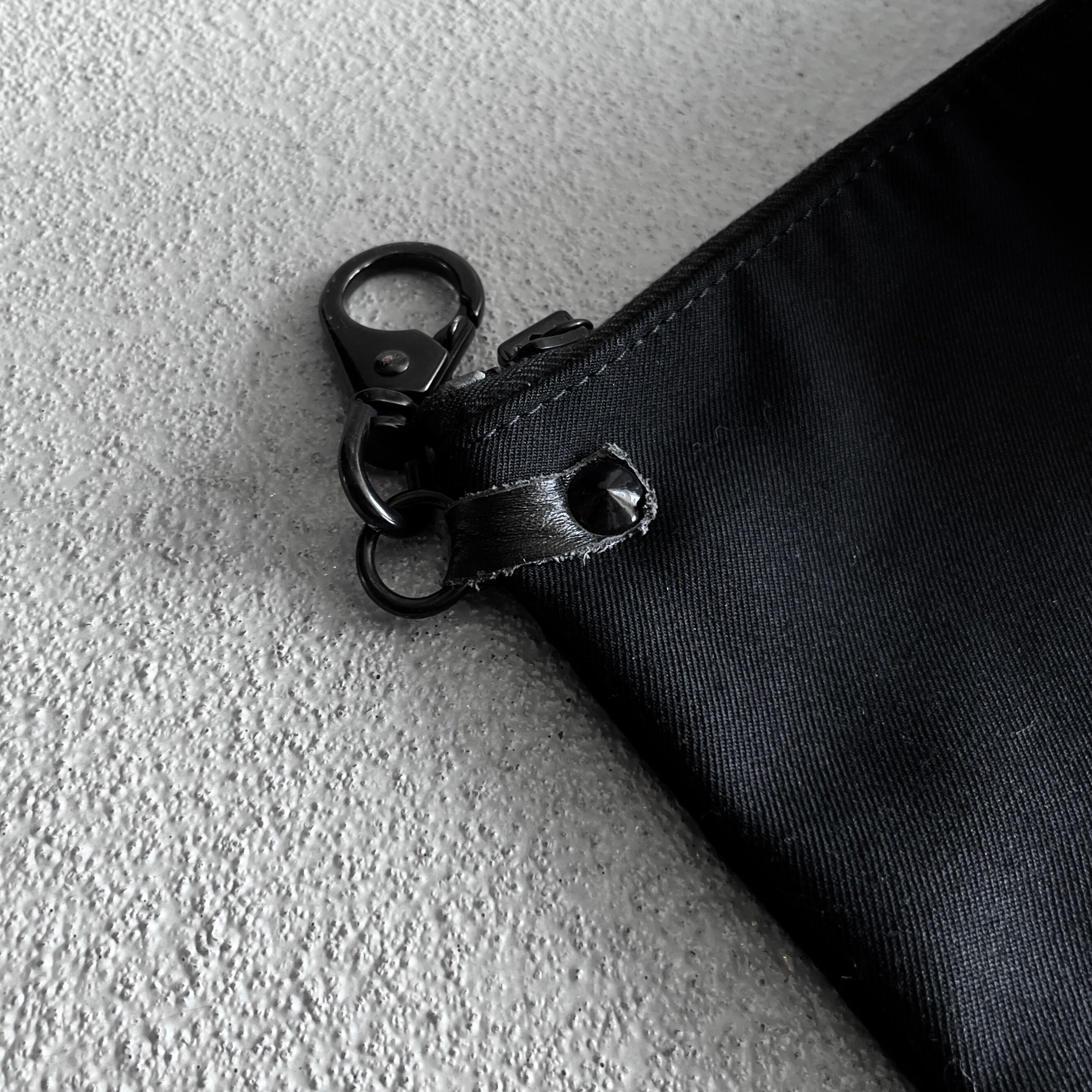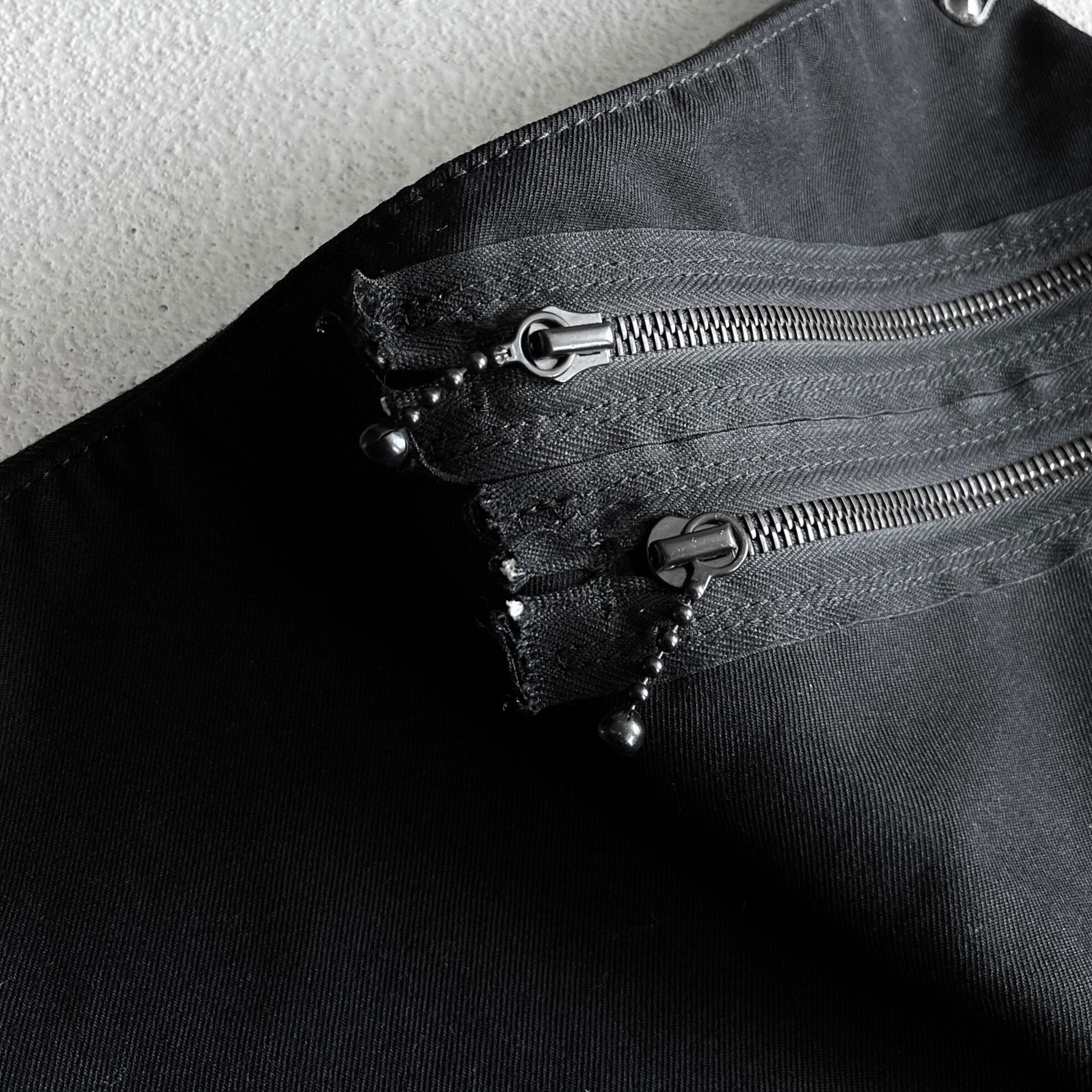 ファスナーテープが剥き出しの2つのジップポケット、引き手部分はボールチェーン仕様に加え金具取り付け部分にはスタッズが打ちこまれた無骨な雰囲気のバムフラップ型のバッグになります。