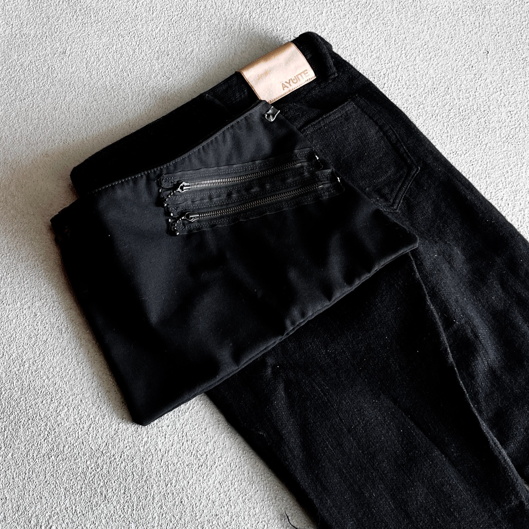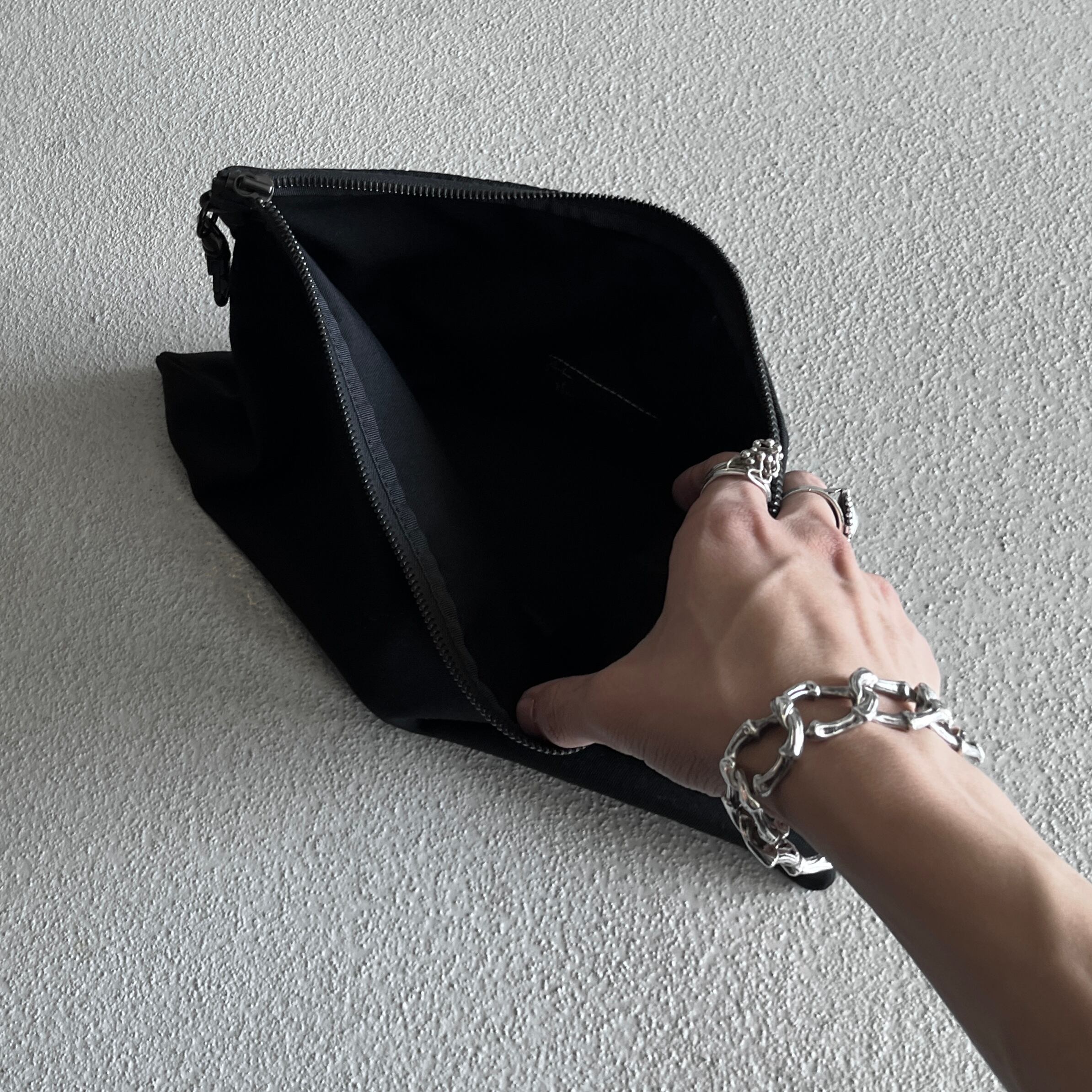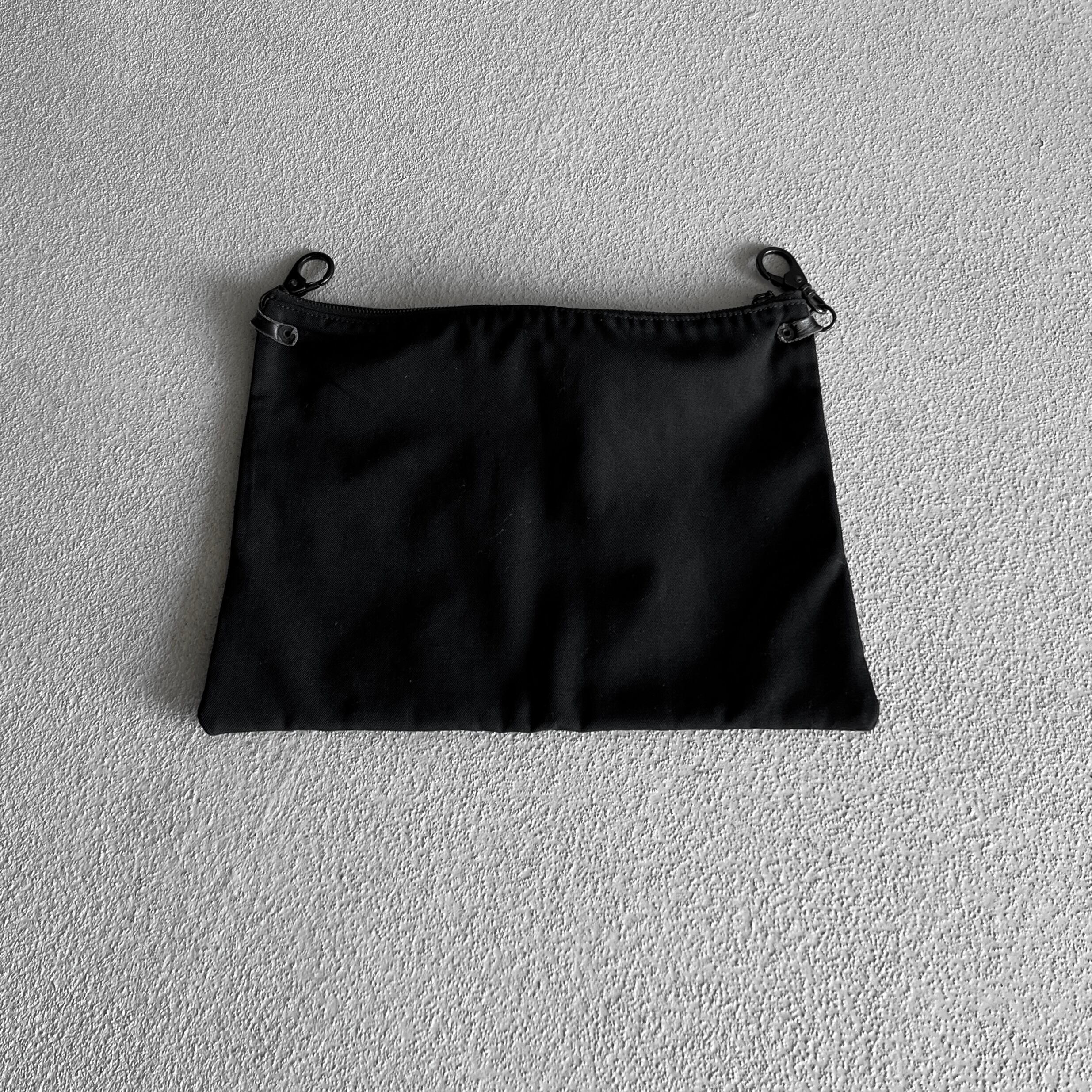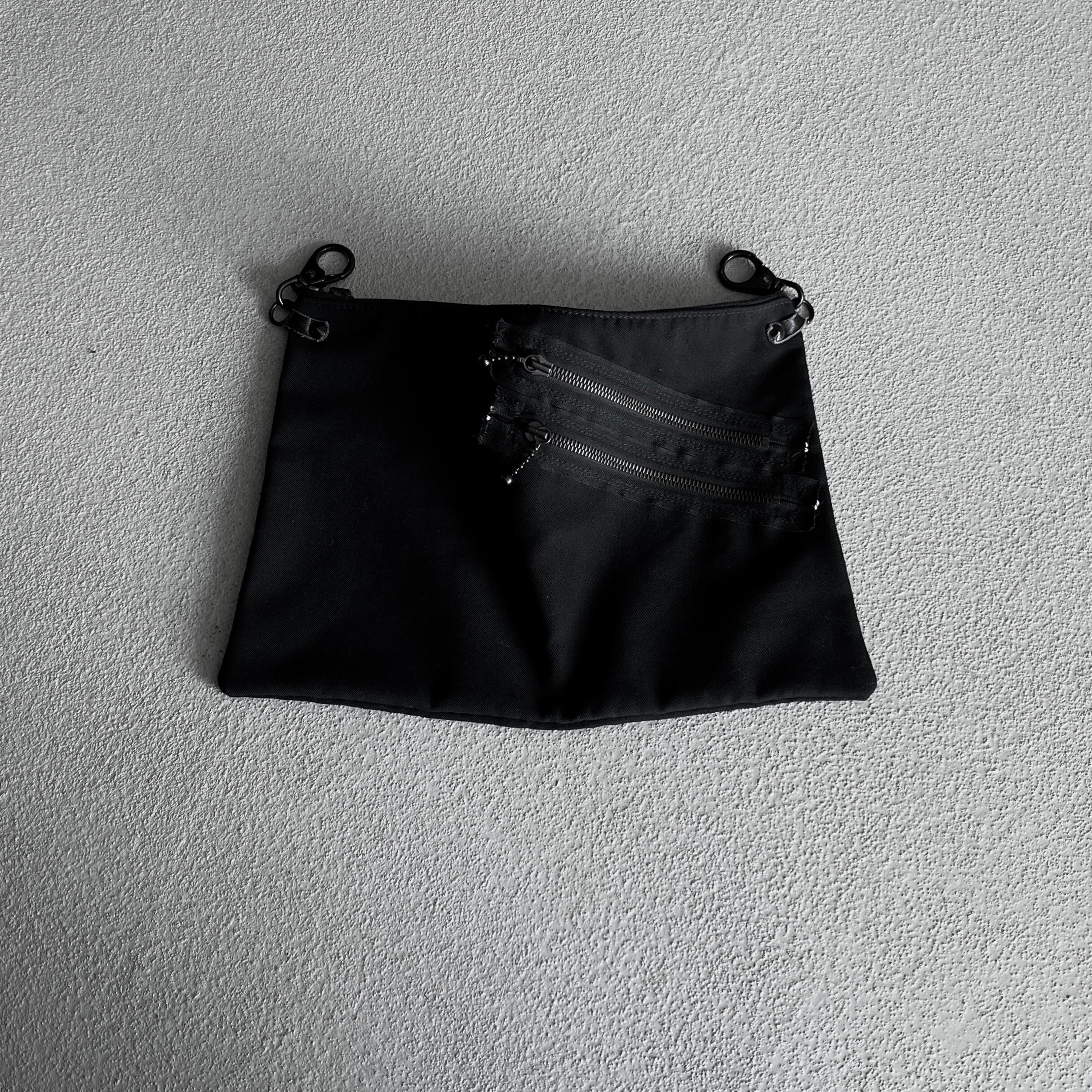 ファスナーテープが剥き出しの2つのジップポケット、引き手部分はボールチェーン仕様に加え金具取り付け部分にはスタッズが打ちこまれた無骨な雰囲気のバムフラップ型のバッグになります。
