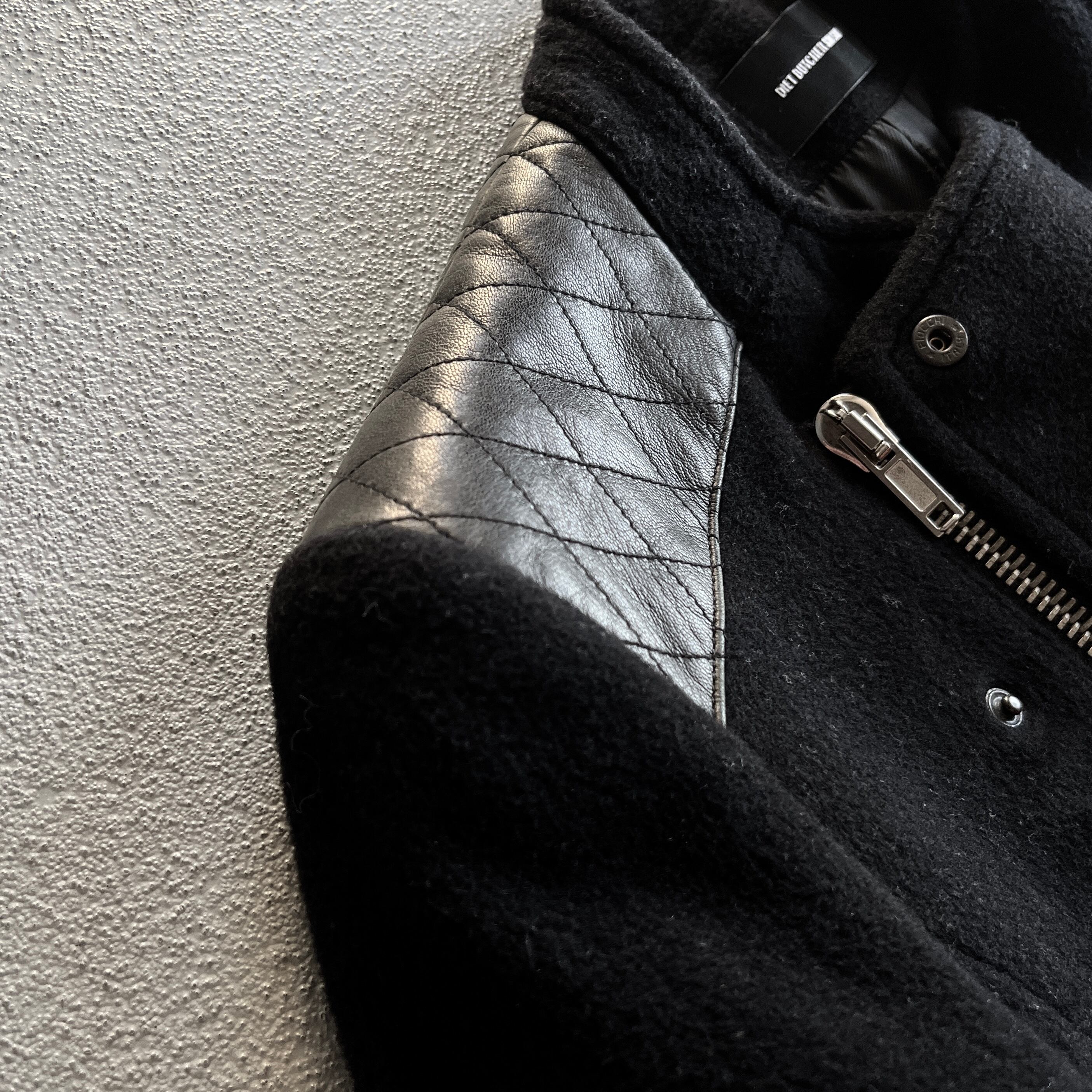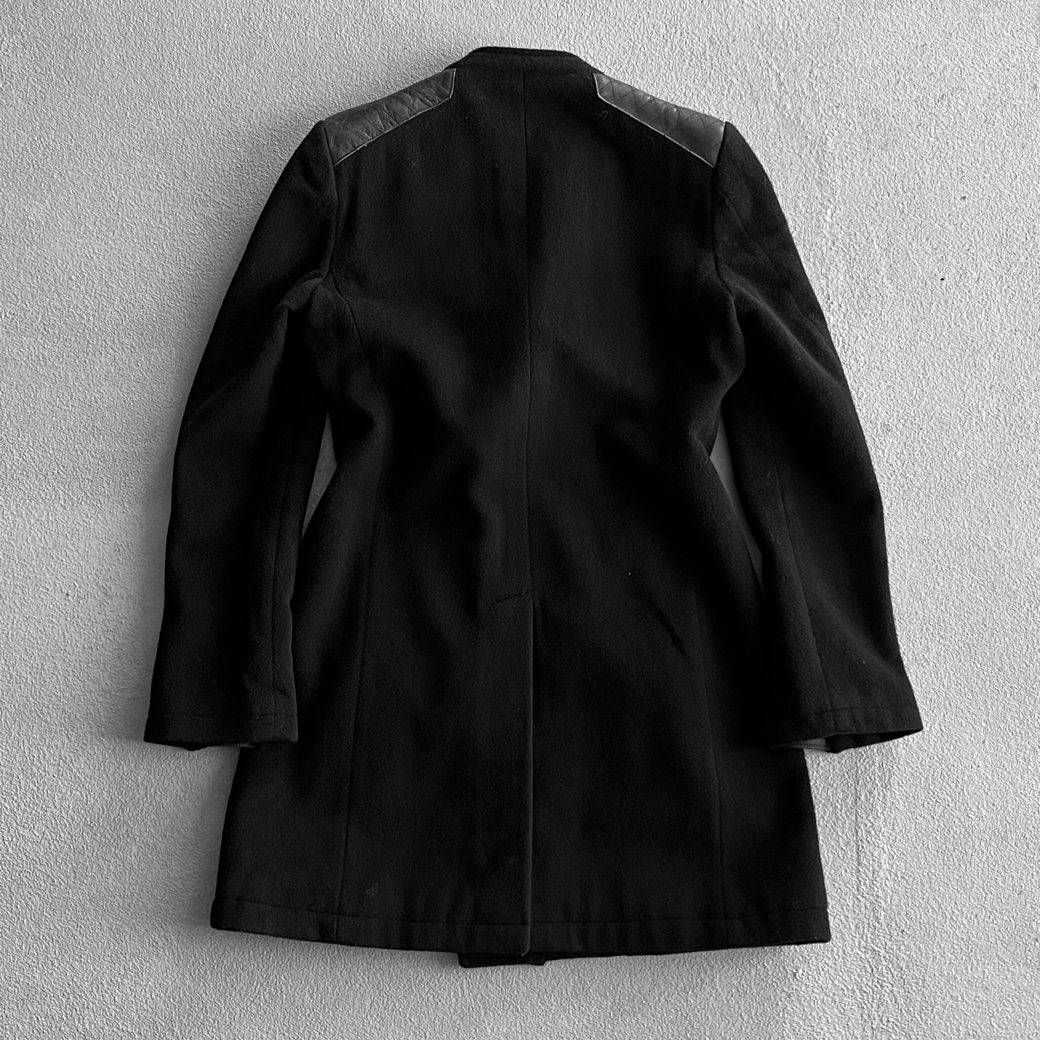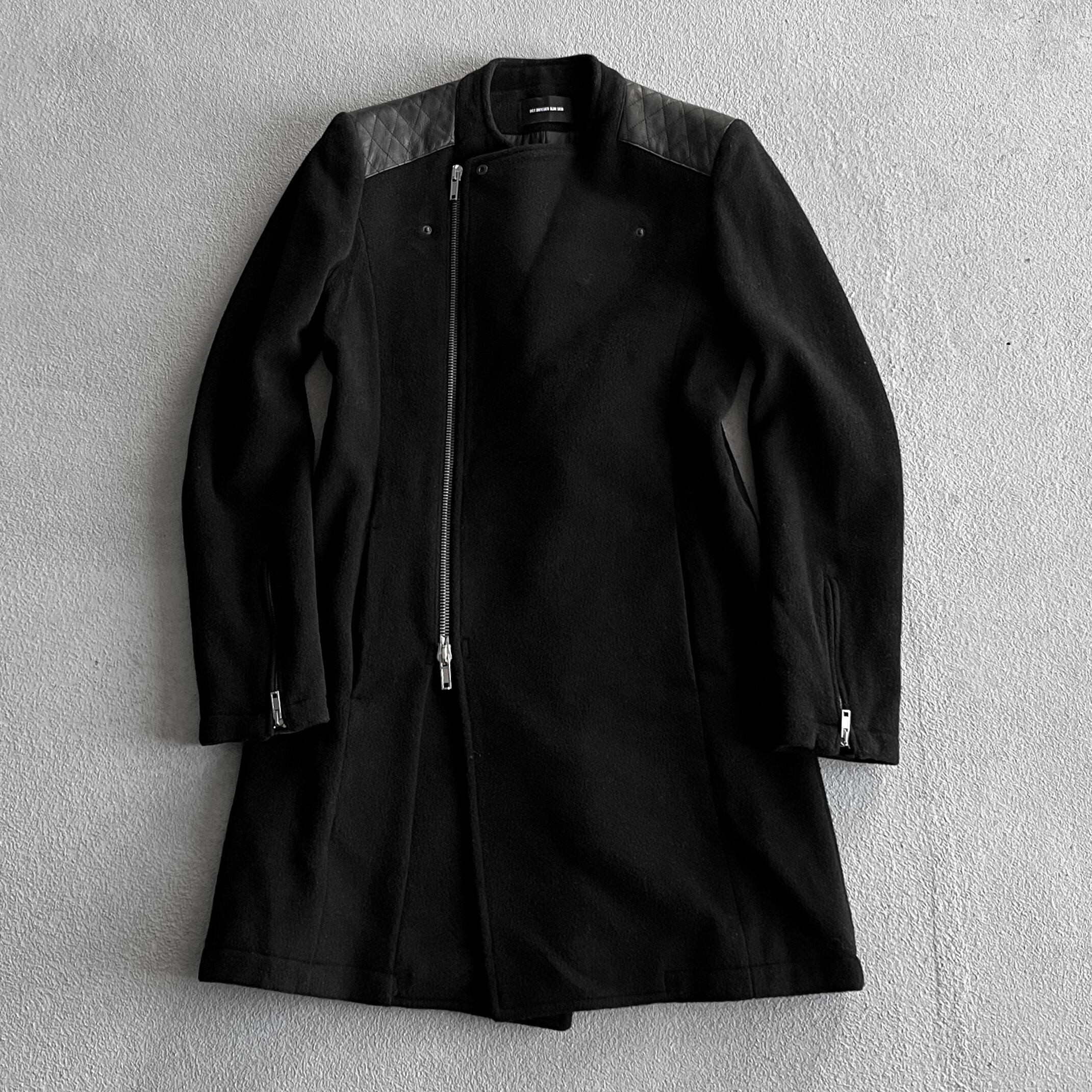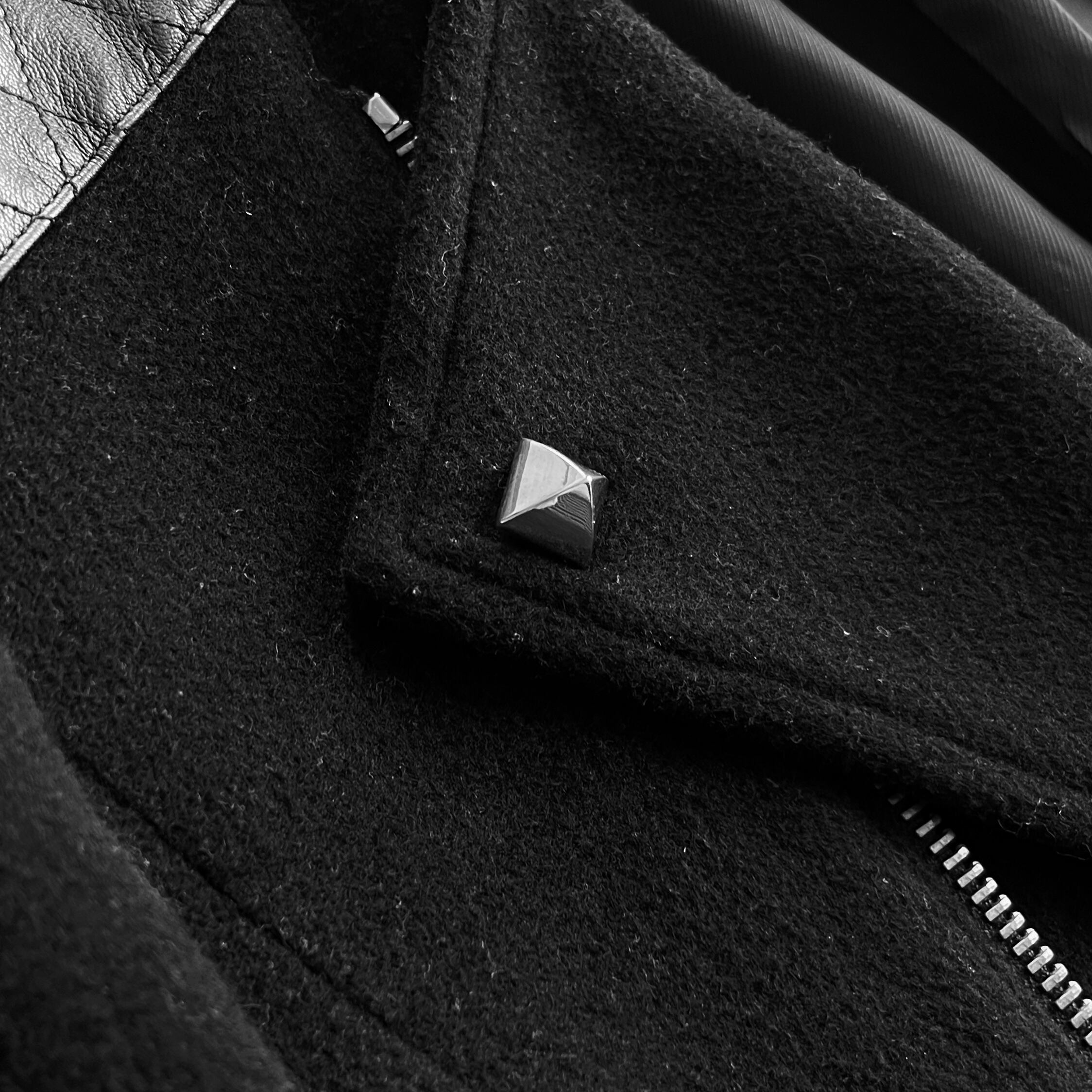 このシーズンを象徴するようなライダース型のもので襟部分には両サイド二つのスタッズチャーム、前面はダブルジップ仕様、肩パッチは本革によって縫い付けられています。また