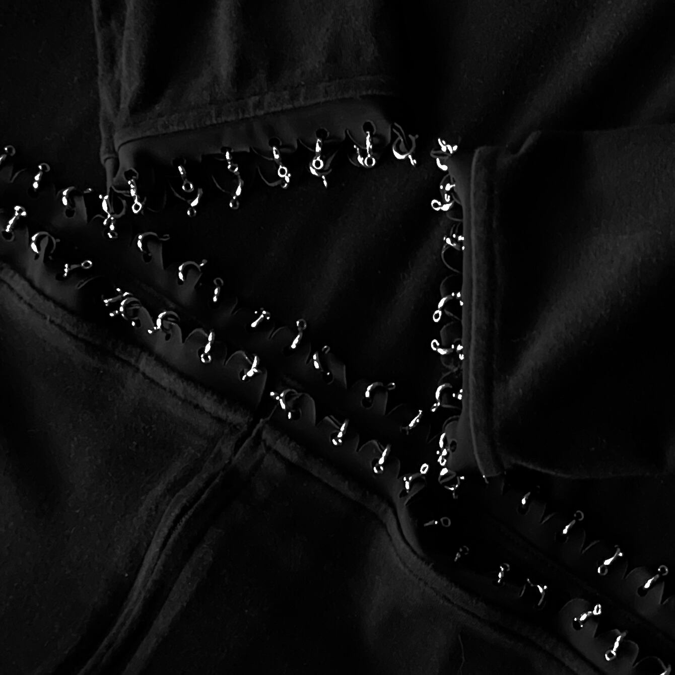 特徴として袖先、裾にフープピアスのような装飾が施されています。