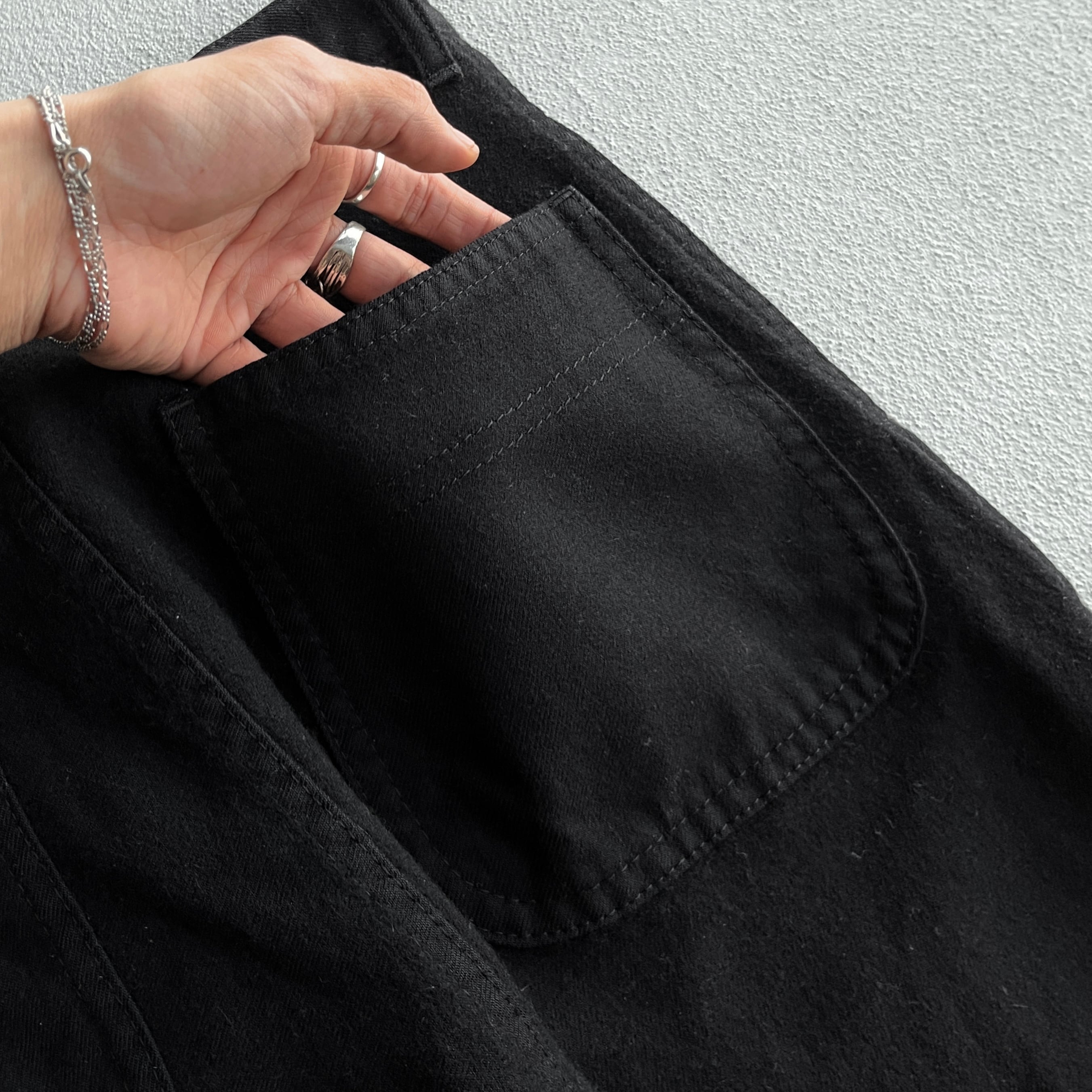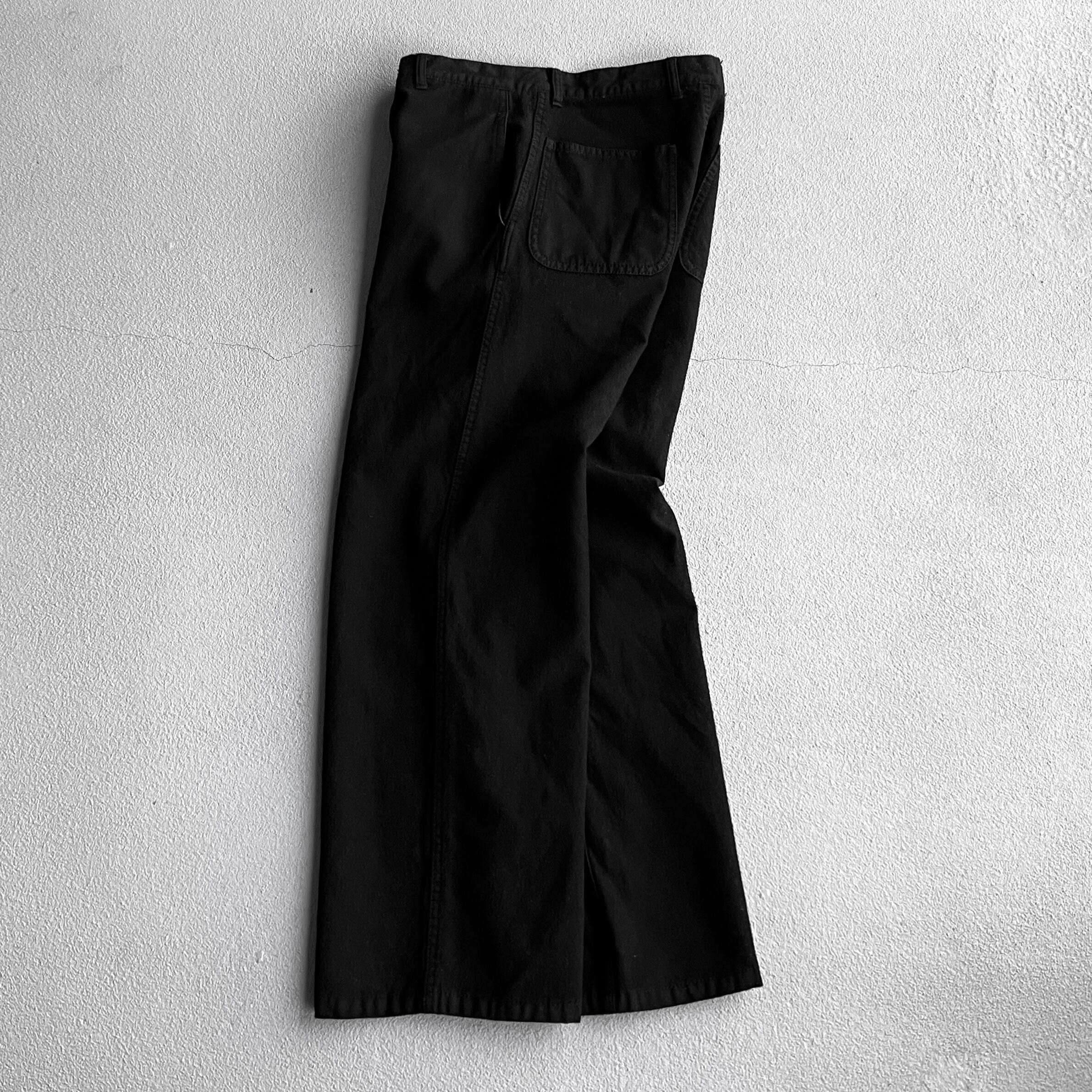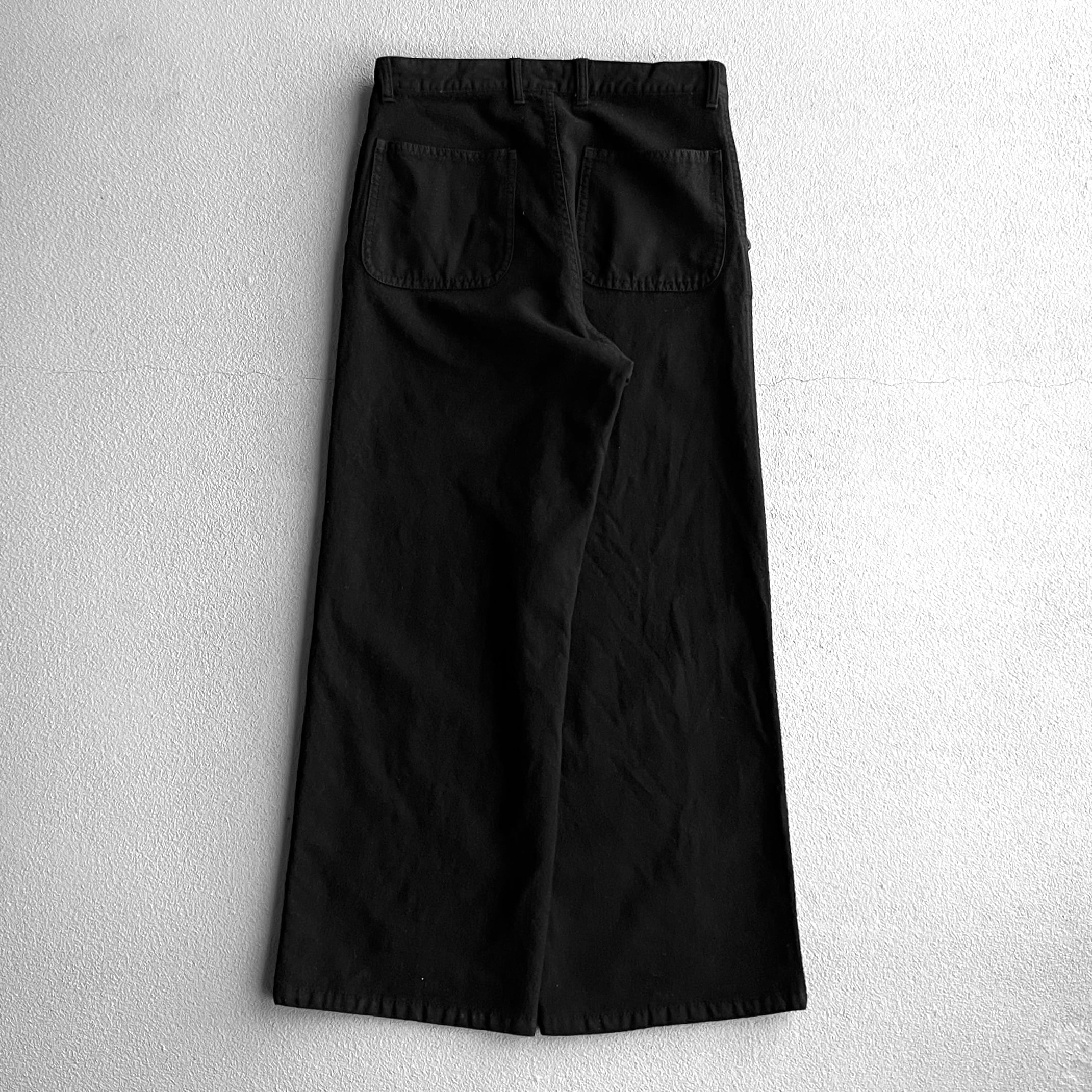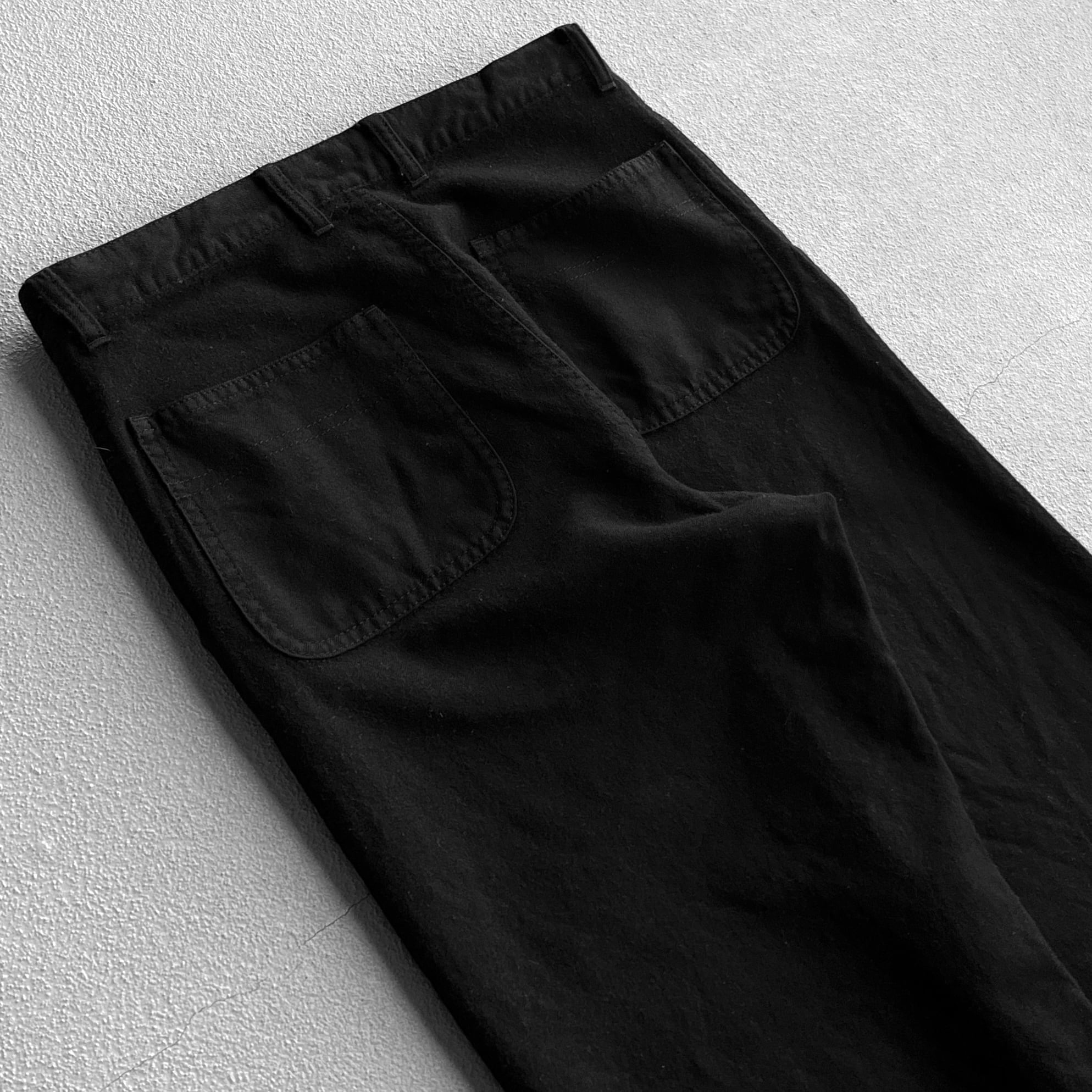 深めに取られた股上で、ゆるやかにテーパードがかったワイドシルエット。全体はは柔らかな風合い、防寒性に優れた肉厚なメルトンウールの生地でメタリックなykkzipにステッチデザインのバックポケットと細部までこだわりを感じられます。